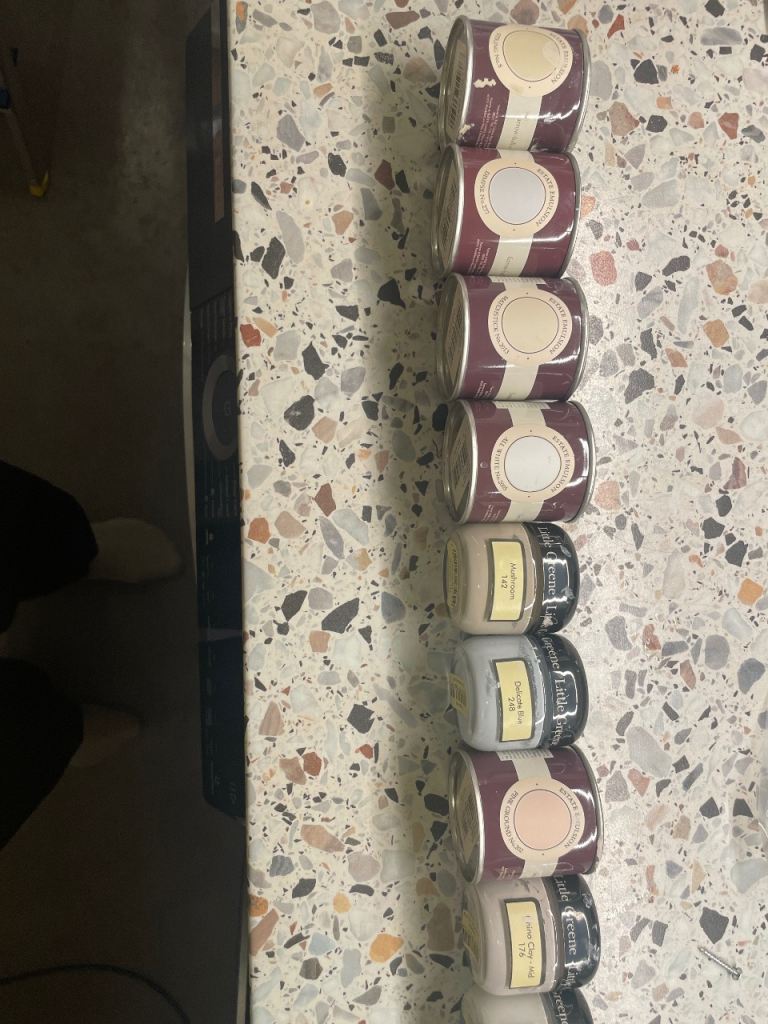 Posting for under a monthFarrow & Ball and Little Greene sample pots with brush