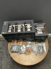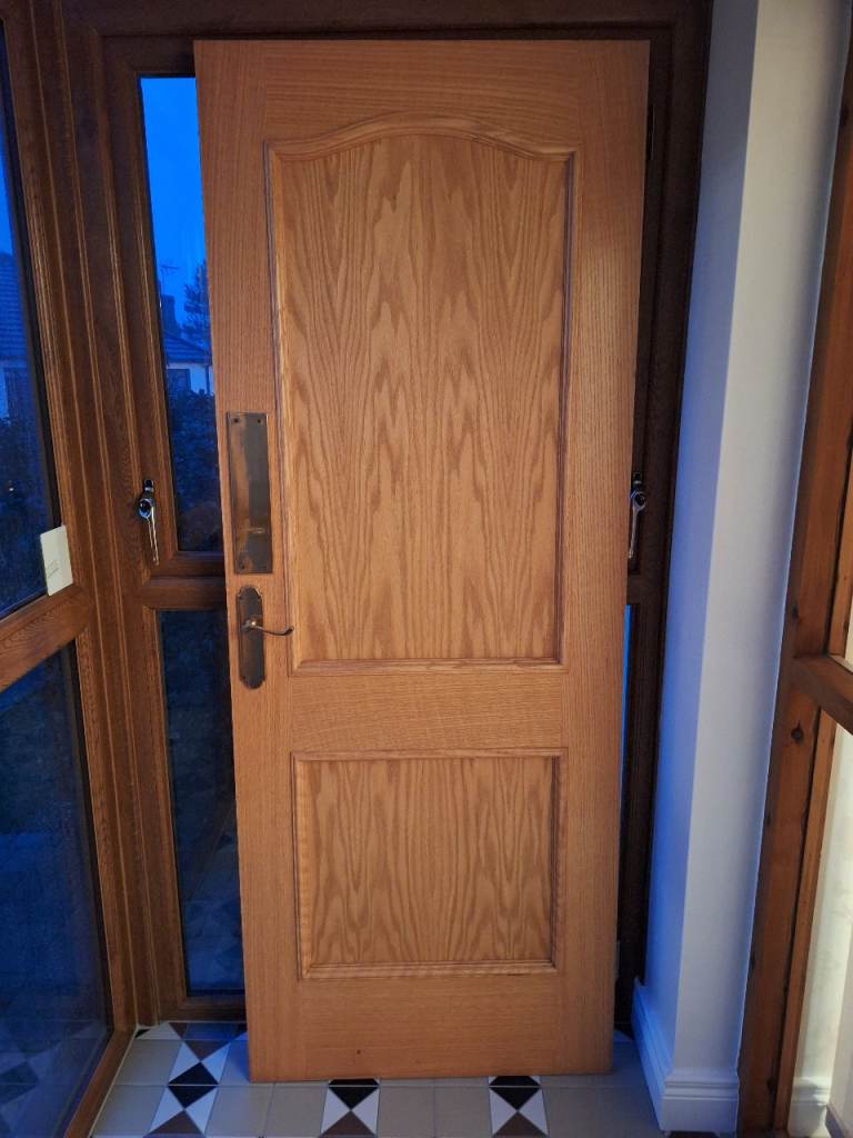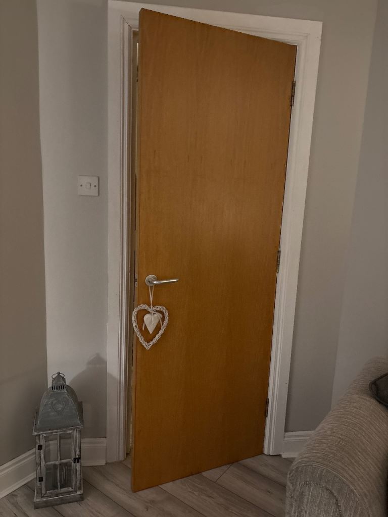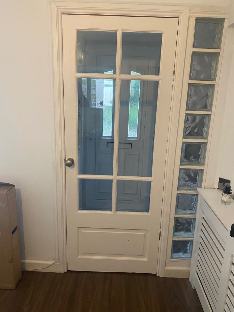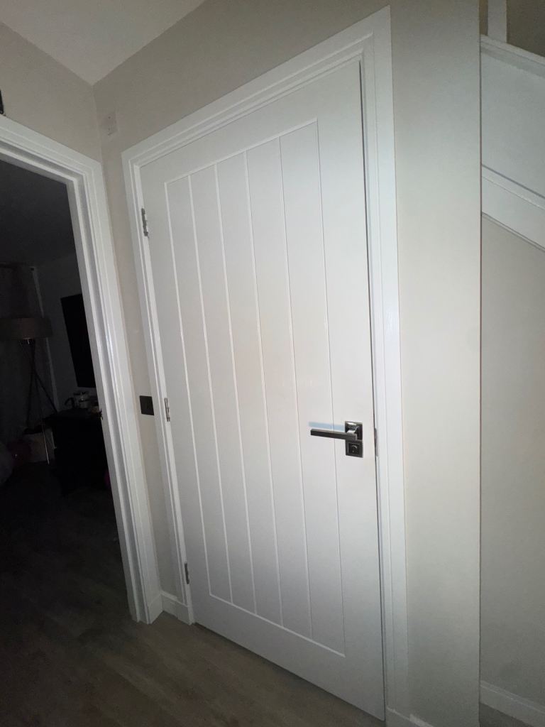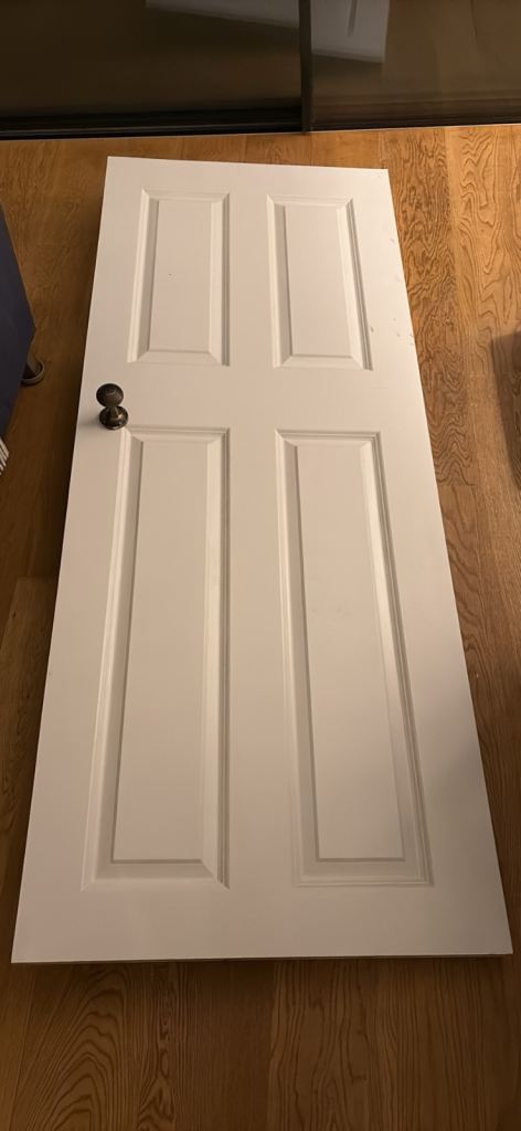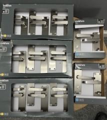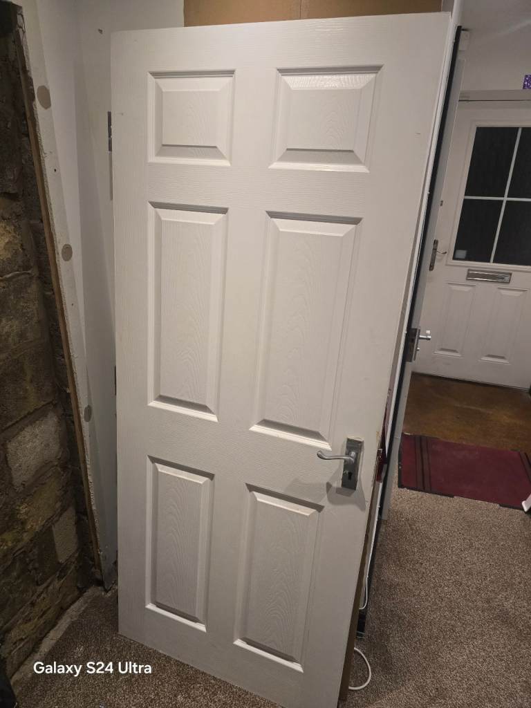 Set of 10 x four-panel white internal doors together with all necessary door furniture required for fitting, including , chrome plated tubular latches, and butt hinges, plus satin finish door handles (2 with locking mechanism for bathroom use). All unused in original packaging. Purchased for home project but never used. Original purchase value approx £800.