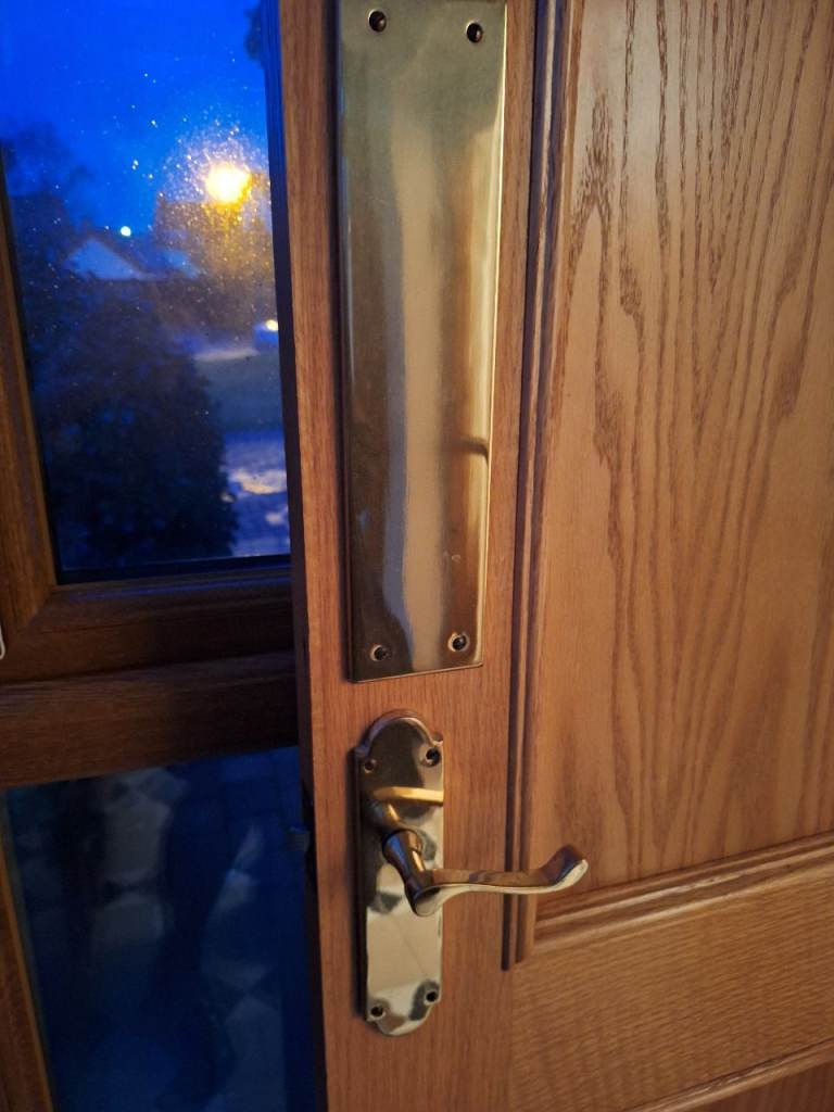 Comes with brass handles, latch, finger plates and 3.5" hinges.