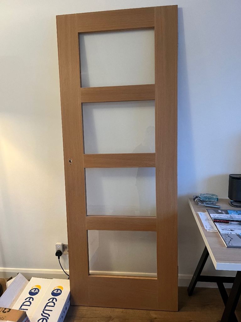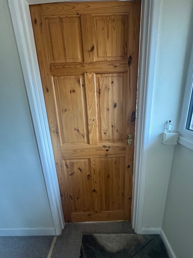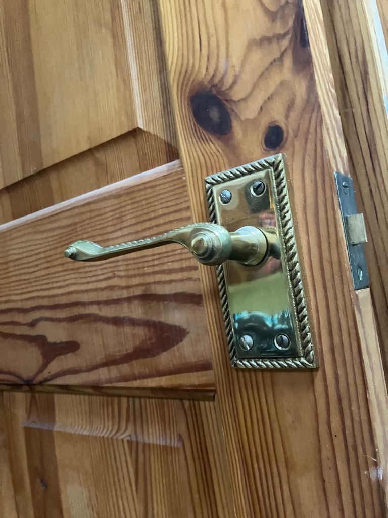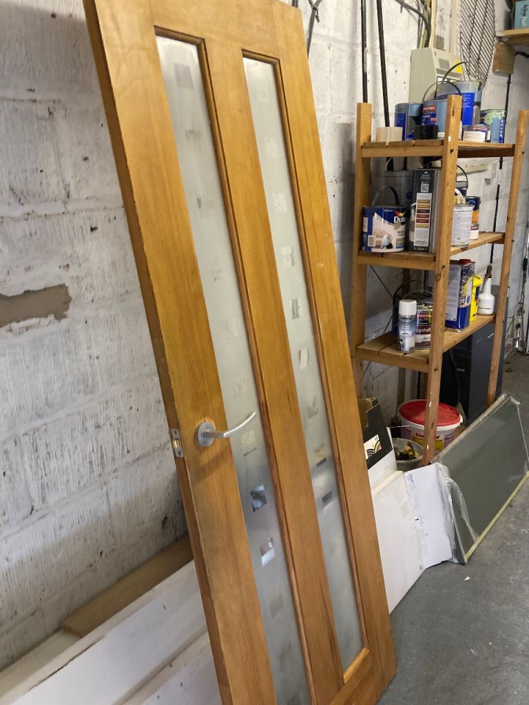 Varnished pine wood door, including brass handles. Standard internal door size.