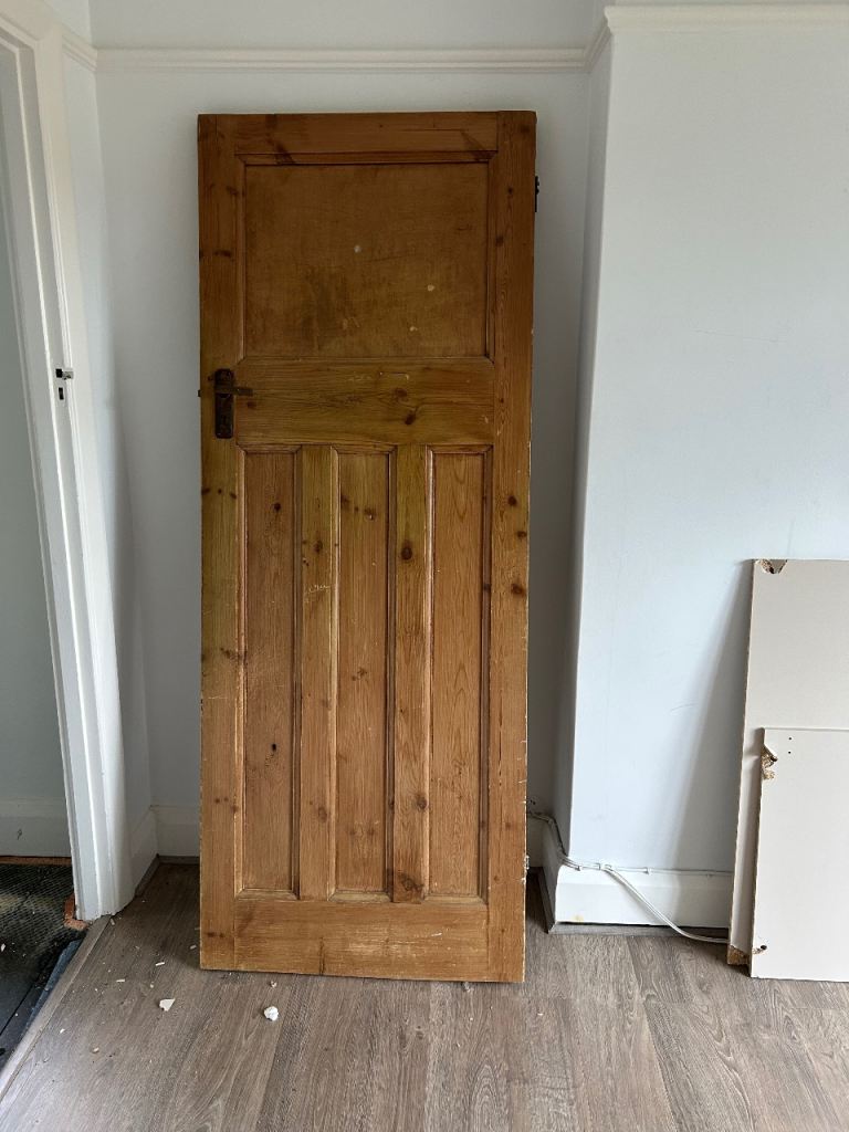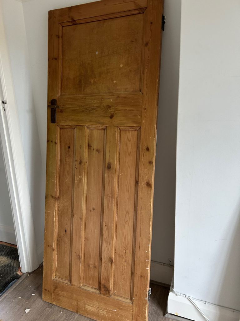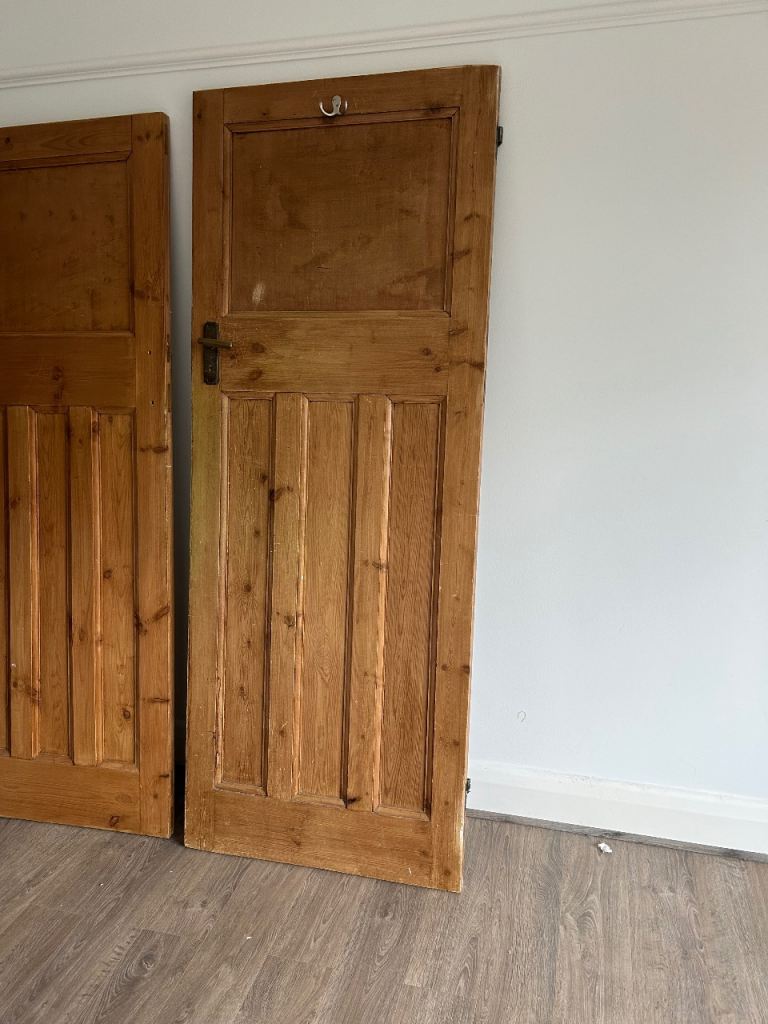 Reclaimed 1920s/1939s pine “one over three” panel interior doors with brass hardware dimensions 74.5 cm w x4.5 cm d x 194 cm h good condition selling due to house renovation price is per door have 5 of this size