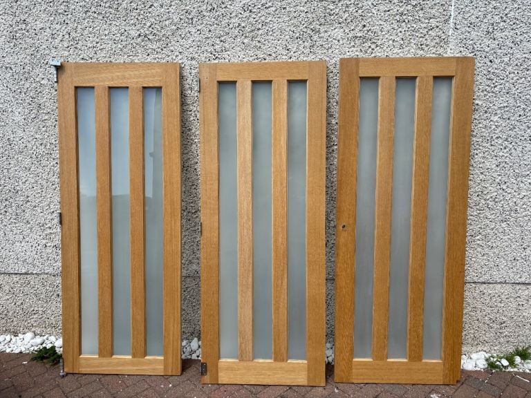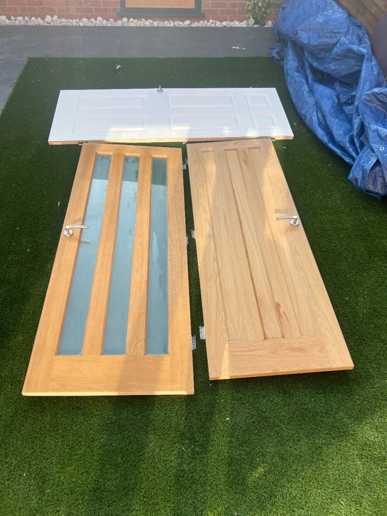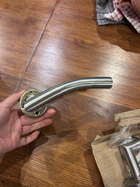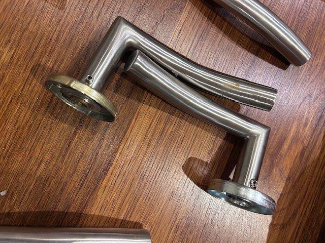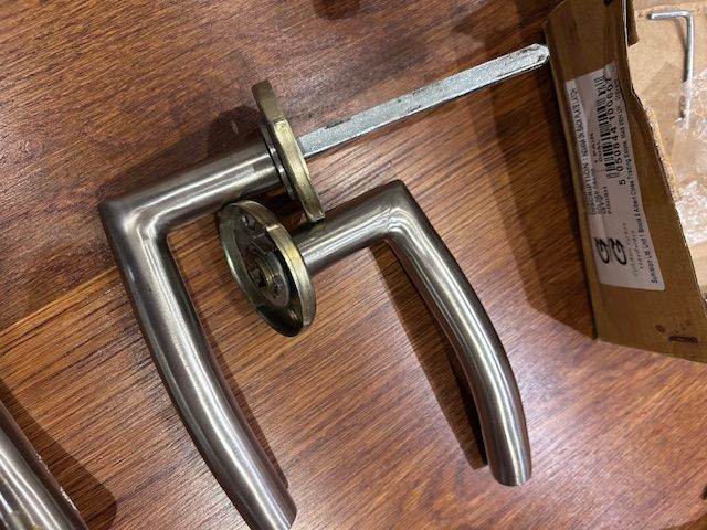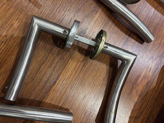 Set of 5 moder brushed stainless steel lever door handles. Good condition and removed during a recent renovation, includes spindle bars and fixings.