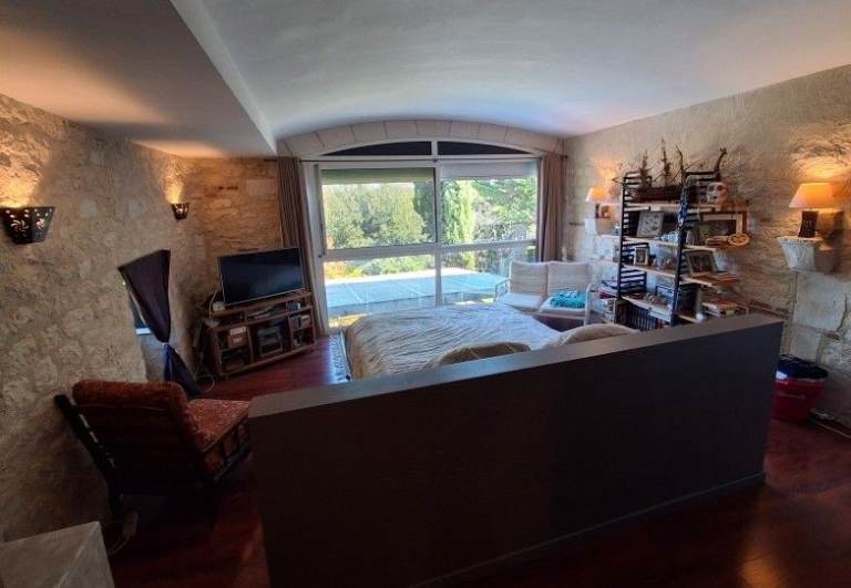 On the 1st floor, an independent WC, a first bathroom surrounded by 3 bedrooms. Then the highlight, a master bedroom with a 45 m2 alcove including dressing room & shower room with WC, offering a view of the surrounding hills.