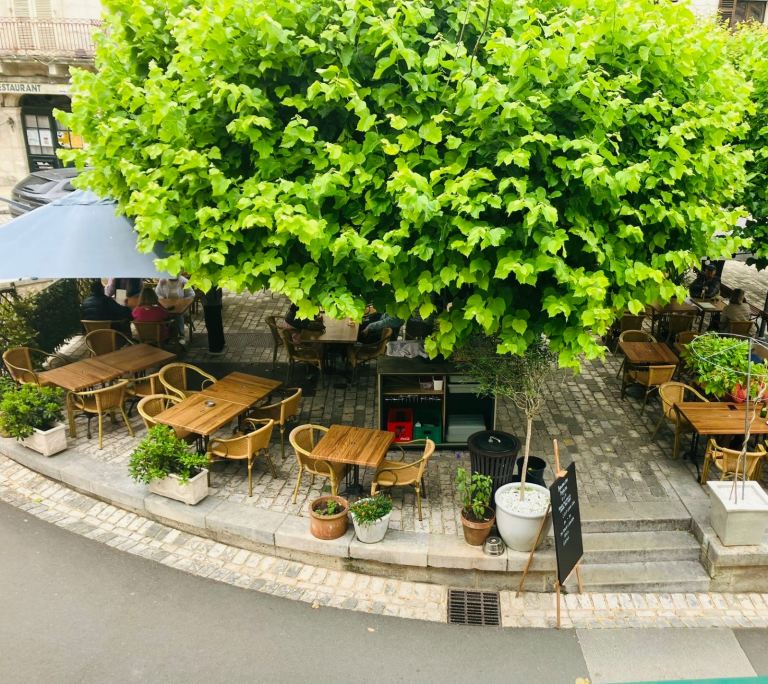 • Market square terrace, shaded by lush trees