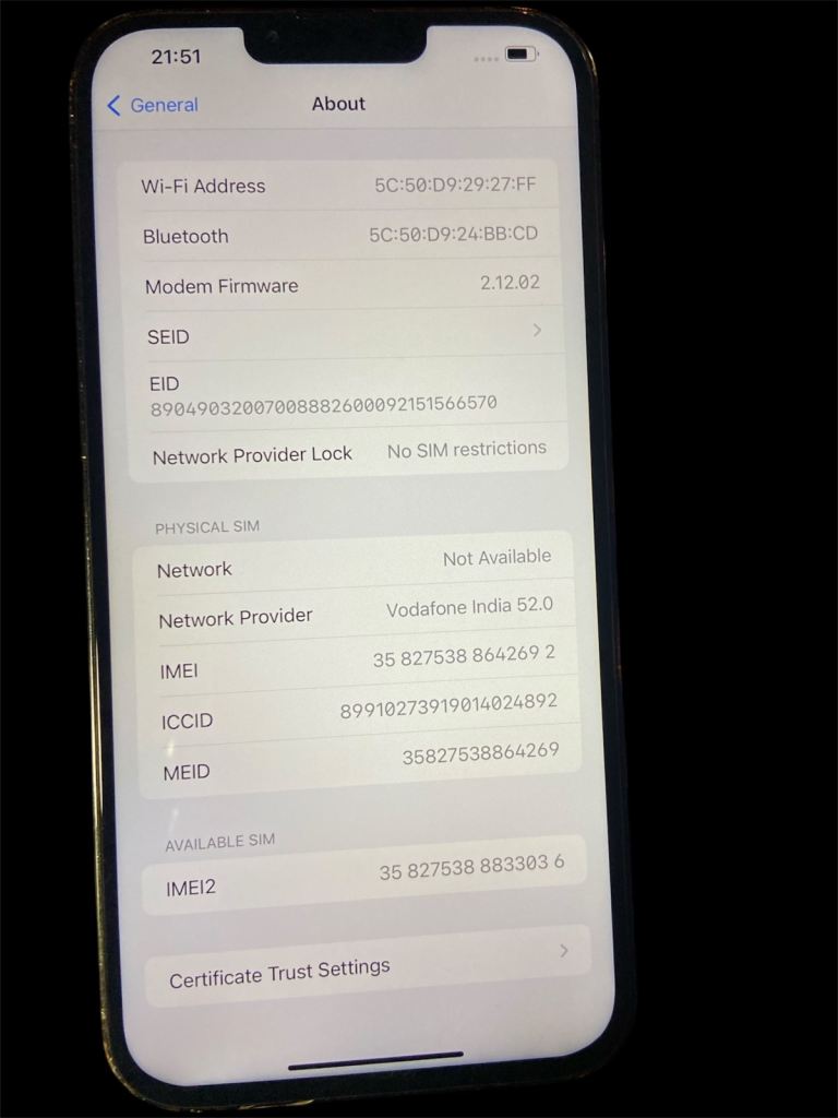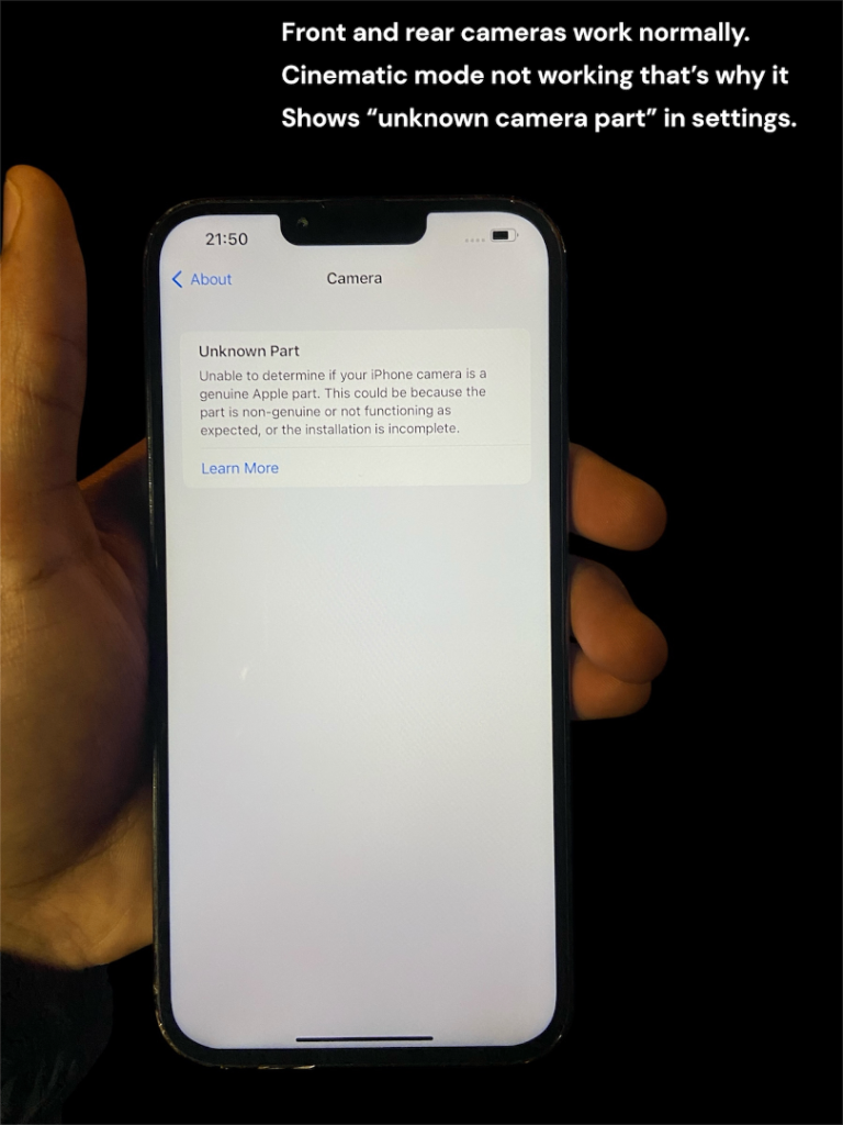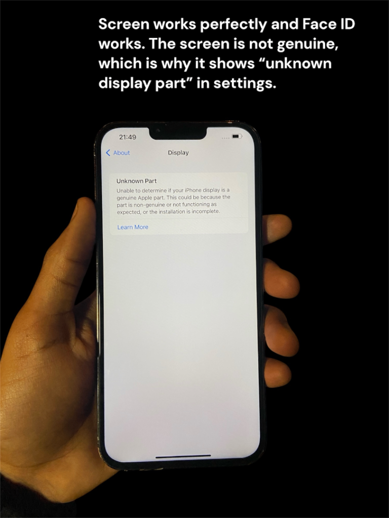 • Screen works perfectly but has been replaced previously so settings show “unknown display part”