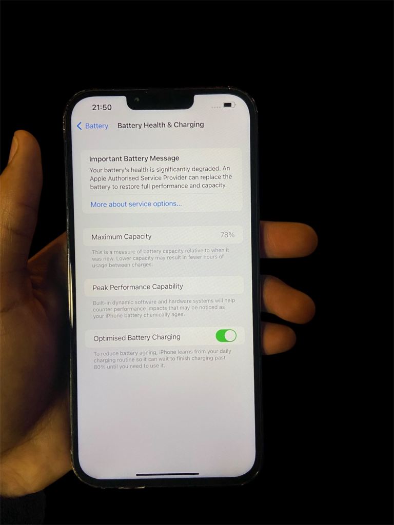 • Battery health shows service recommended