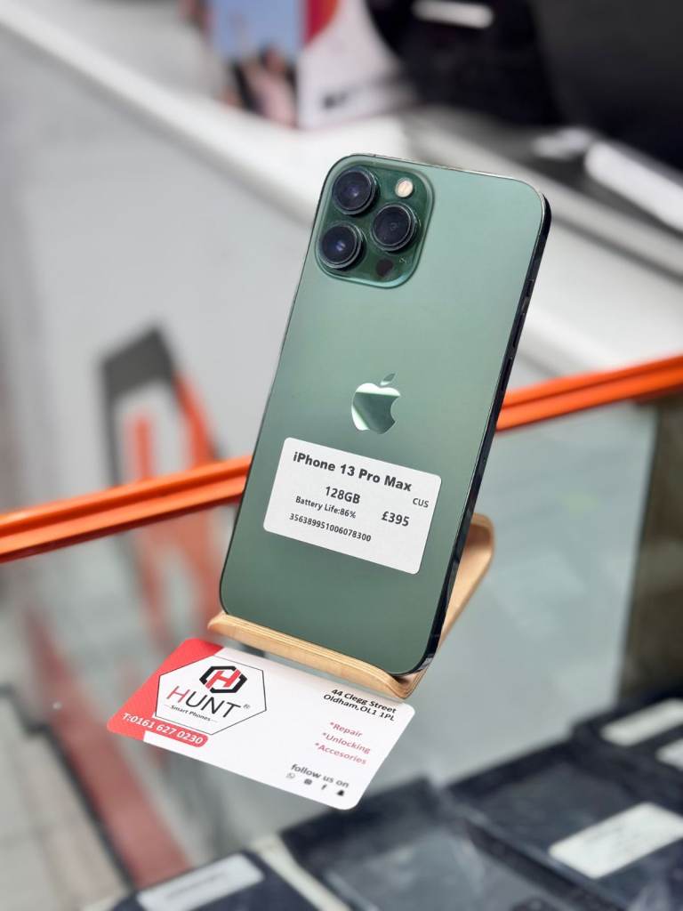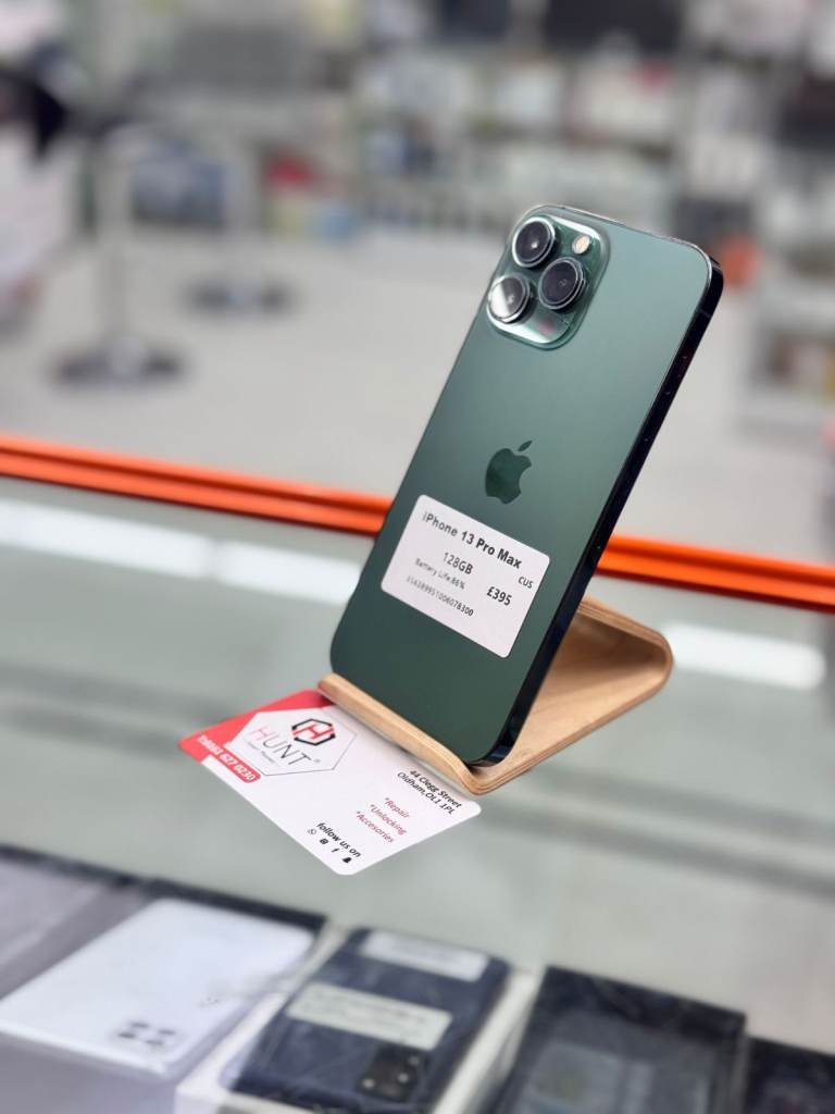 Apple Iphone 13 pro max green excellent condition 128gb internal storage unlocked mobile phone to all networks. You will also get Shop Warranty with the Phone