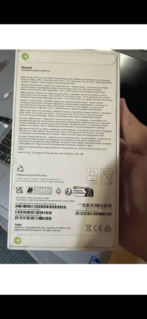 Comes with Box, lightning to usbc cable for fast charging, inserts and sim pin.