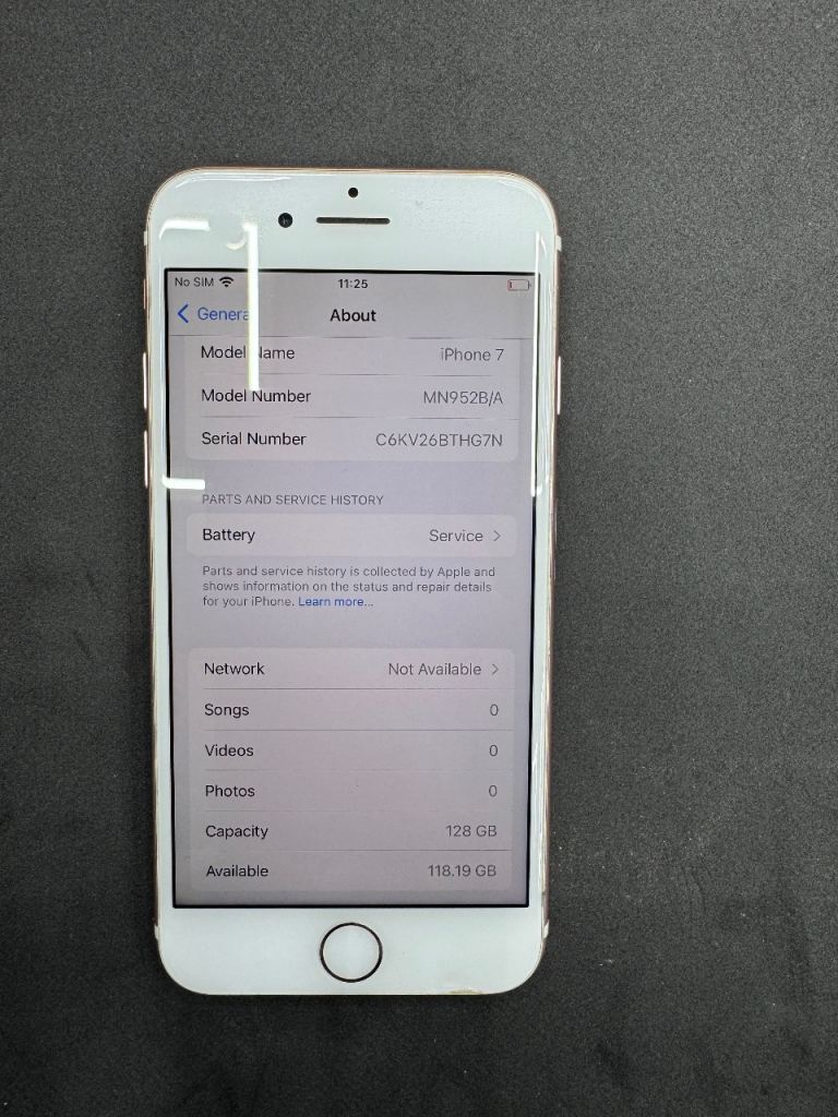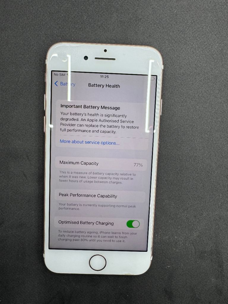 • Battery: The battery health is at 77% and shows a "Service" message. The phone still works and charges fine, but it drains quickly. It will eventually need a new battery if you want it to last all day.