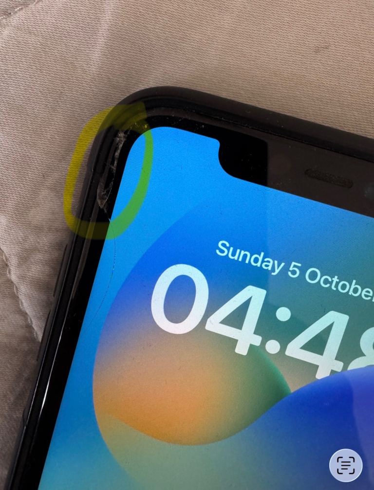 iPhone 11, 128GB in black. Slight crack on top left of screen but does not affect functionality