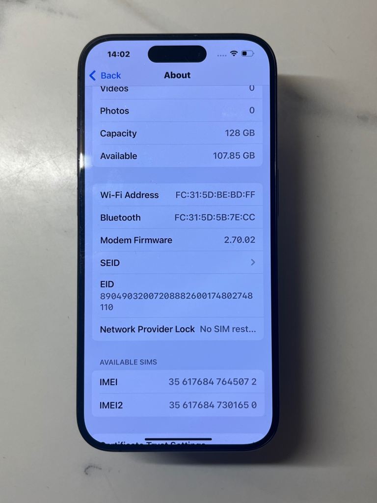 Here I have my iPhone 15 pro and some details about it are below you can also find IMEI number in the last photo the verify this is a genuine device