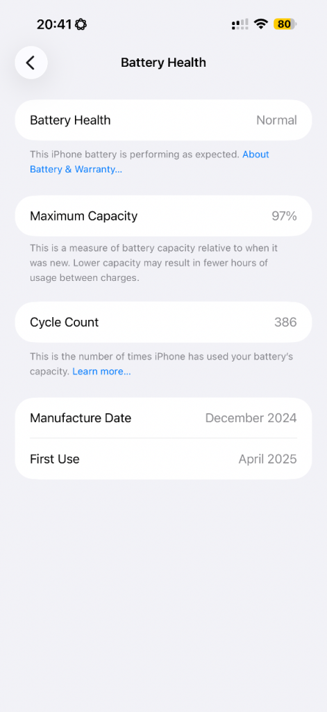 • Battery Health: 97% — outstanding for a phone of this age, reflecting how carefully it’s been maintained