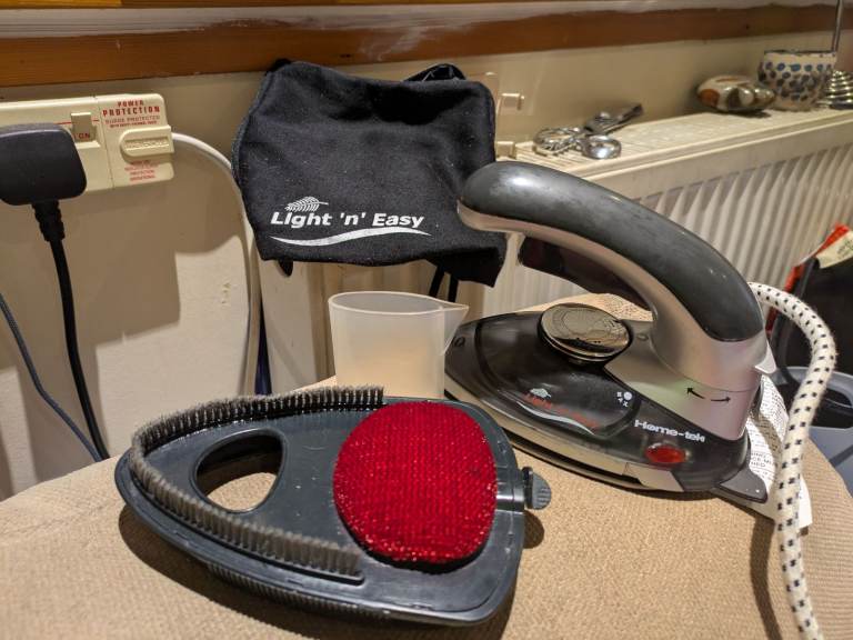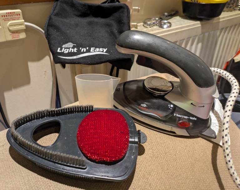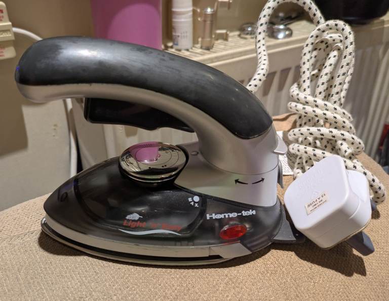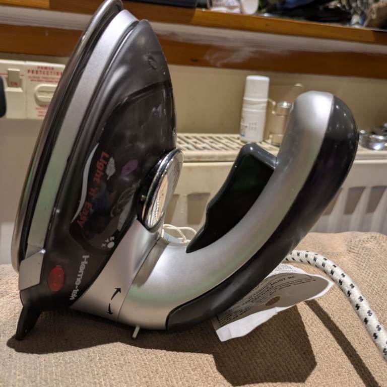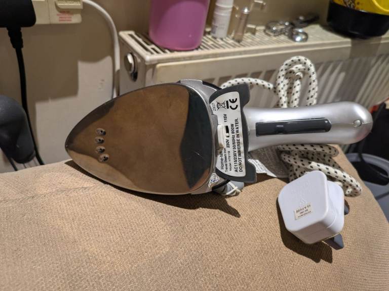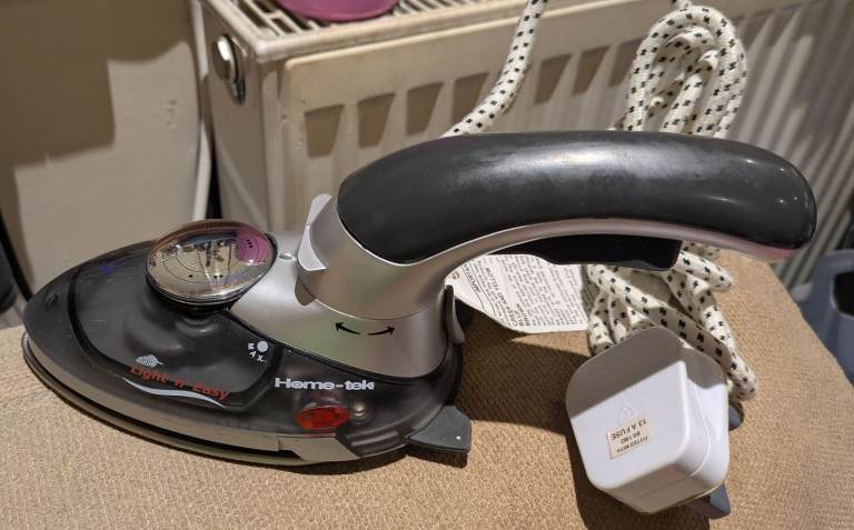 Great little iron stainless steel plate as new. Handle rotates to use off the ironing board like clothes on the hanger or curtains while hung