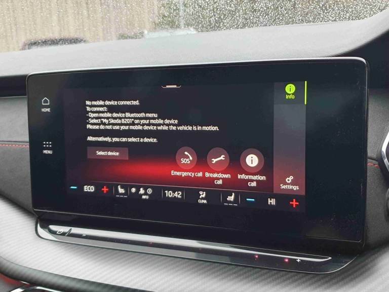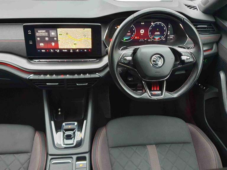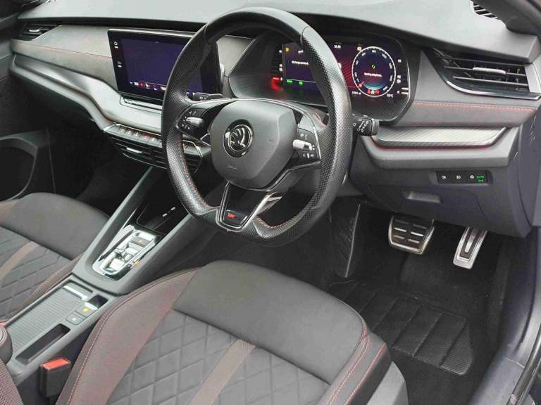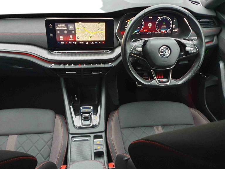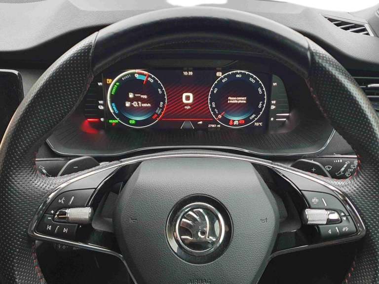 ..1x USB Type C port in rear view mirror (charging only), 2x USB Type C ports in rear of front centre armrest (charging only), Bluetooth system, Columbus satellite navigation with 10'' touchscreen display, E mode button for electric/hybrid drive, eCall emergency system, Front and rear parking sensors with manoeuvre assist, Front assist system, Progressive dynamic steering, Smartlink (includes android auto and mirrorlink), Speed limiter, Turn Assist, Unique iV instrument panel, Virtual Cockpit - 10.25'' digital display, Voice control system, Wireless SmartLink for Apple Car Play, 10 amp mains UK 3 pin charge cable mode 2, 16 amp AC charge cable for wallbox/charge points mode 3, E-noise generator for electric drive with noise emitted upto speed of 50km/h, Front and rear stabilizers, 2x USB Type C ports (for charging and data transfer), 8 Speakers, DAB Digital radio, Aero front windscreen wipers with intermittent function, Auto dimming rear view mirror, Body colour door handles, Chrome exhaust tailpipes, Door sills with vRS logo, Electric front and rear windows, Exterior gloss black sports styling including front grille, side strip, window surrounds, door mirror and badging, Full LED Matrix headlights with AFS and cornering front fog lights, Headlight washers, Heated rear windscreen, High level third brake light, Ice scraper in fuel cap, LED daytime running lights, Rain and light sensors, Rear fog light on one side, Rear privacy glass, Rear side wing doors, Unique iV badge on tailgate, vRS bumpers and lip spoiler, 3 rear headrests, 3 seat bench in 2nd row, 4 foldable roof handles, Aluminium pedals, Black headlining, Black microsuede padded dash panel with red contrast stitching, Charging socket cover on front left fender, Chrome inner door handles, Front centre armrest, Front head restraints, Heated front seats, Illuminated air conditioned glovebox, Leather trimmed gearshift lever, Luggage compartment lighting x1 light, Mechanical rear seat release, Parcel shelf - folding, Single front passenger seat, Sport button for hybrid drive delivering maximum system performance, Storage compartment for charging cables under the luggage compartment mat, Sunglasses storage, Textile floor mat set, Three spoke leather sports multifunction steering wheel with paddles, Ticket holder, Umbrella in door panel, Unsplit rear bench seat and split folding backrest, LED interior light pack - Octavia, 3 point front/outer rear seatbelts+pre-tensioners, Alarm with interior monitoring,