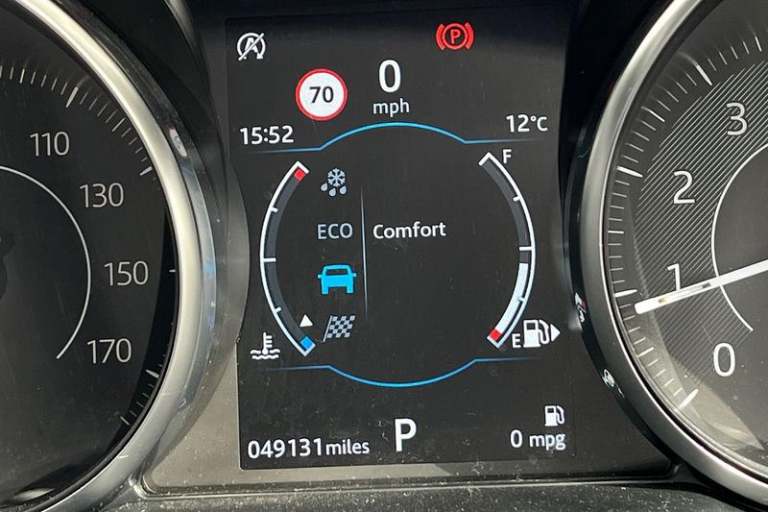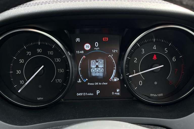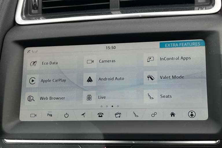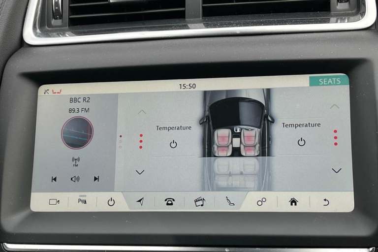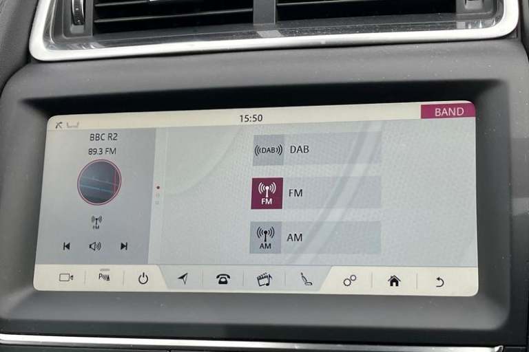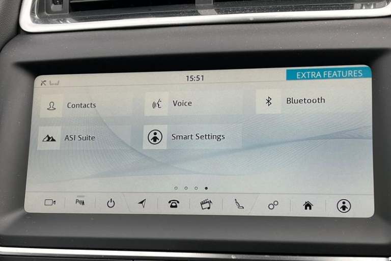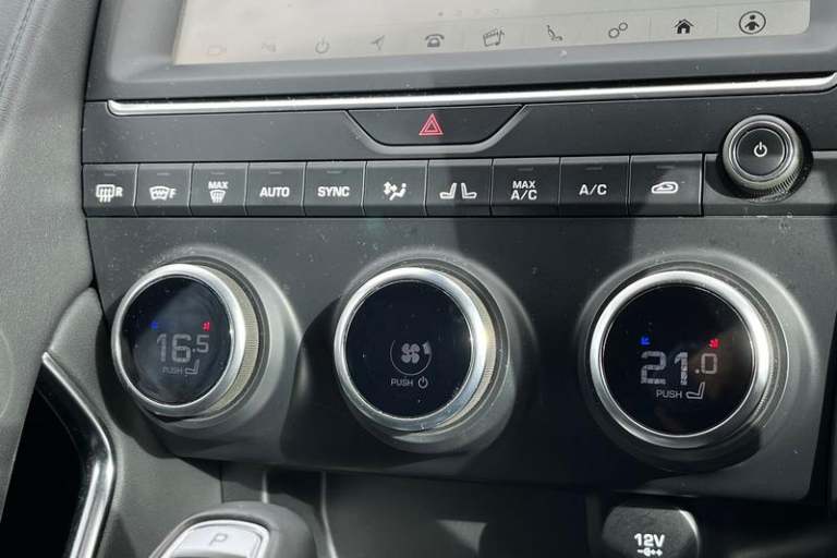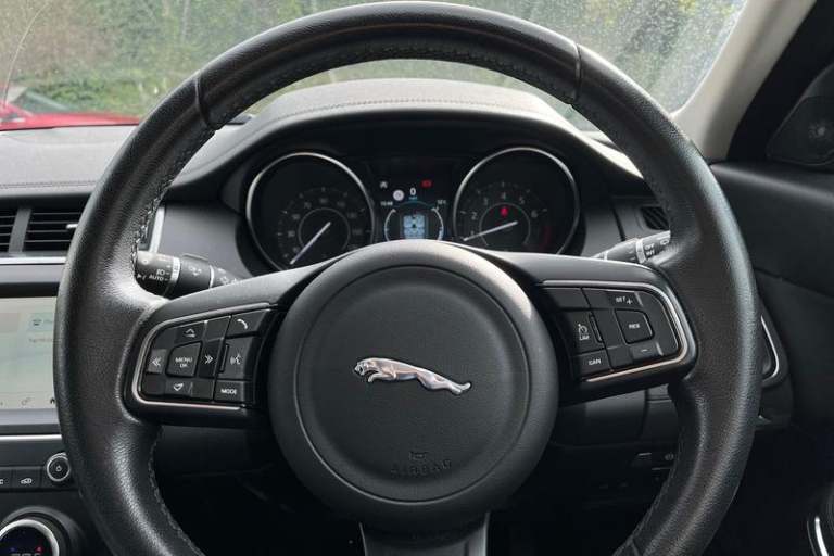 Driver condition monitor, Eco driving style assistant, Electric power assisted steering, InControl remote, InControl Touch navigation pro, Lane keep assist, Outside temperature gauge, Push button starter, Speed proportional steering, Start up sequence with movement in dials and lighting, Traffic sign recognition with adaptive speed limiter, Trip computer, Voice control system, 3 flash lane change indicators, Approach Illumination, Auto dimming rear view mirror, Automatic headlights, Body colour bumpers, Electric front/rear windows with one touch/auto up/down, Grained black door claddings, Heated front windscreen, Heated rear window with timer, Heated washer jets, Jaguar script and leaper, Rain sensor windscreen wipers, Rear fog lights, Tailgate/boot lid spoiler, Twin tailpipes with finishers, 12V power socket in rear, 2nd row 60/40 split/fold, 2nd row air vents, 3 seat bench in 2nd row, 4 Load area hooks, Centre armrest console, Centre headrest in row 2, Elasticated loadspace side strap, Front head restraints, ISOFIX on outer rear seats, JaguarDrive selector, LED lighting in overhead console, Loadspace cover, Loadspace lamp, Passive front headrests, Storage net in luggage compartment, Sunvisors with illuminated vanity mirrors, Tie down hooks in luggage area, Twin front cupholders, Two zone climate control, 350mm front brakes, 3x3 point rear seatbelts, ABS, All surface progress control (ASPC), Customer configurable autolock, DSC - Dynamic Stability Control, Electronic brake force