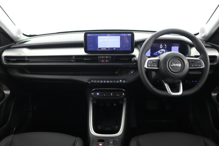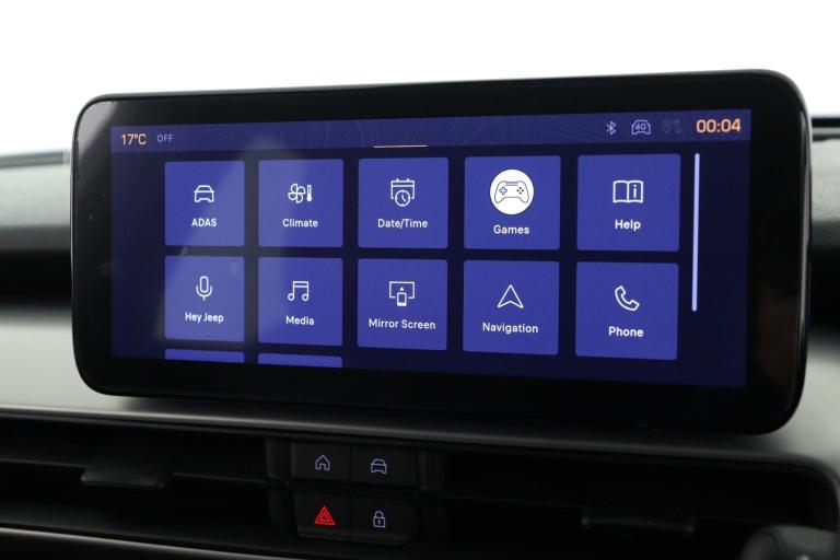 ..(AEB) Autonomous Emergency Braking with pedestrian and cyclist recognition, 10.25'' Full TFT reconfigurable colour cluster, 180 Degree rear camera with drone view, 360 degree parking sensors, Adaptive cruise control, All-Terrain Mode Selector, Apple Carplay/Android Auto with wireless mirroring, BSRF connectivity box, Connectivity services, Drowsy driver detection system, eCall emergency call system, EV Drive Mode Selector, Intelligent speed assist, Keyless Start/Engine On Button, L2 Autonomous driving, Lane Centering, Lane departure warning, Lane keep assist, Odometer, PAS, Quick Guide English, Rear parking sensors, Telematic box and connected services, Traffic jam assist, Traffic sign recognition, Urban blind spot monitor, Warranty Booklet - UK, Wireless charging, 11KW onboard charger, Battery default, Ev/Phev Electrically Driven Temperature Control, Ev/Phev Fast charging, Ev/Phev Quick charging, EV/Phev Second Life Ready Battery, Ev/Phev Smart Charging, Ev/Phev Smart Charging Port, Mode 3 cable, Audio system with 6 speakers, Radio controls on steering wheel, Rear USB port with type-C charging, 7 Slots grille in gloss black, All power windows express Up/Down, Automatic headlights, Automatic high/low beam, Body colour exterior door handles, Dusk/Dawn light sensor, Frameless auto dimming interior rear view mirror, Full LED headlights, Headlight levelling control, LED 3rd brake light, LED daytime running lights, LED Fog lamps with cornering function, LED rear lights, Mirror covers painted gloss black, Power foldable mirrors, Rain sensor, Rear side wing doors, Rear wiper, Silver skid plates, Welcome/leaving lighting, Windshield wiper de-icer, 12V power outlet, 3 rear headrests, 3 seat bench in 2nd row, Automatic A/C (1 Zone), Central console dividers x2, Driver and front passenger sunvisor with vanity mirror, Foldable second row seats 40/60 - Fix and Fold, Front and rear velour floor mats, Front central armrest with storage, Front head restraints, Front passenger grab handle, Front passenger isofix child seat attachment, Front seat backrest pocket, Height adjustable cargo floor, Height/depth adjustable steering wheel, I am Jeep label, Predisposal for tunnel pad cover, Single front passenger seat, Synthetic leather steering wheel, Tunnel pad cover and interior rubber mats ''Jeep'', 6 airbags, Anti-lock braking system (ABS), Child locks on rear doors, Electric parking brake, ESC - Electronic Stability Control + traction control, Front seatbelt pretensioners,