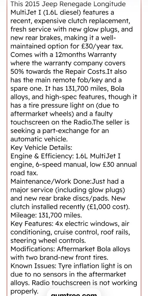 Jeep Renegade 1.6 diesel. 2015 on a 65 plate has covered 132 thou will go up as in use everyday. Has passed a recent MOT and has 12 months Warranty and service history in very very good condition inside and out. See full description in photos.