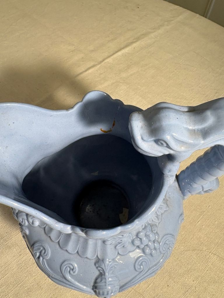 This light blue ceramic item is an antique early Victorian-era relief-moulded jug or pitcher, likely depicting Bacchus or Neptune with grape vine ornamentation.