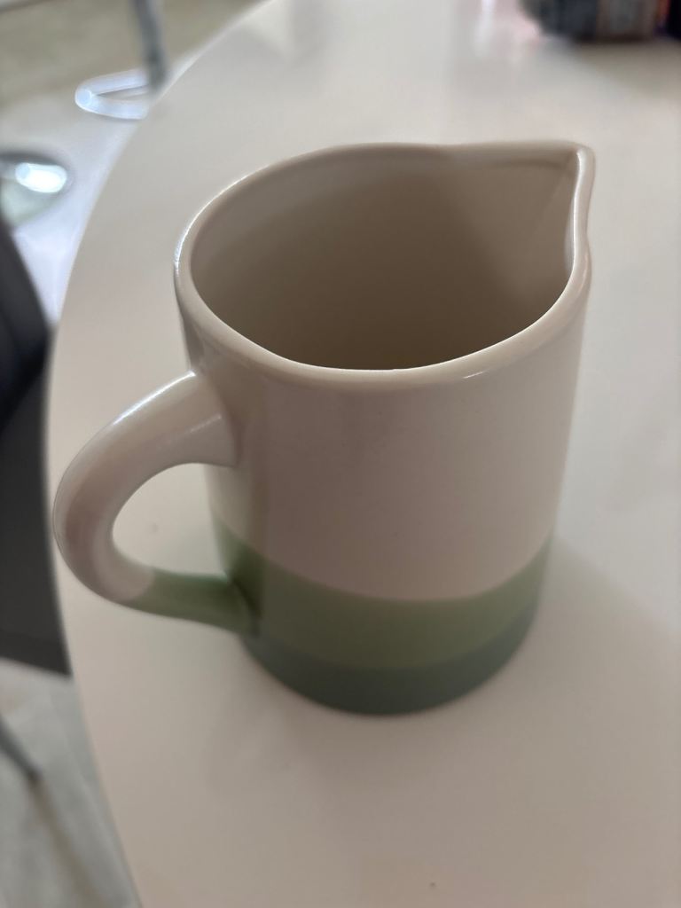 An as new decorative milk jug in white and different shades of green at the bottom. For sale at just £2