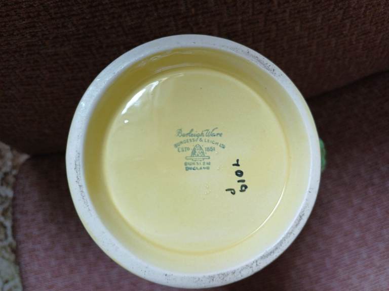 One Very RARE, MINT Vintage BURLEIGH WARE YELLOW BUTTERFLY JUG Art Deco Majolica Pitcher Novelty Floral Jug. From English Pottery Burleigh Ware by Burgess & Leigh circa 1930. It comes this hand painted jug with raised with the very rare version with the Majolica Blue butterflies and flowers on a sunshine yellow ground. The piece comes to you pre-loved in very good vintage condition. Colours are intact with lustre is still glossy and there are no chips, no crazing and no repairs.