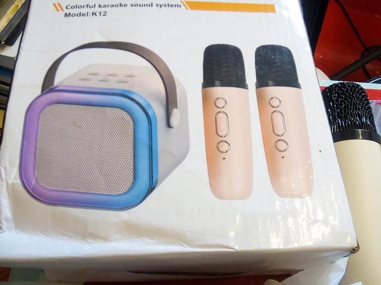 ITS A MINI KARAOKE SPEAKER AND 2 MIKES, AS NEW,IN SMALL BAGS AND INSTRUCTIONS,BOX HAS SOME CREASES,