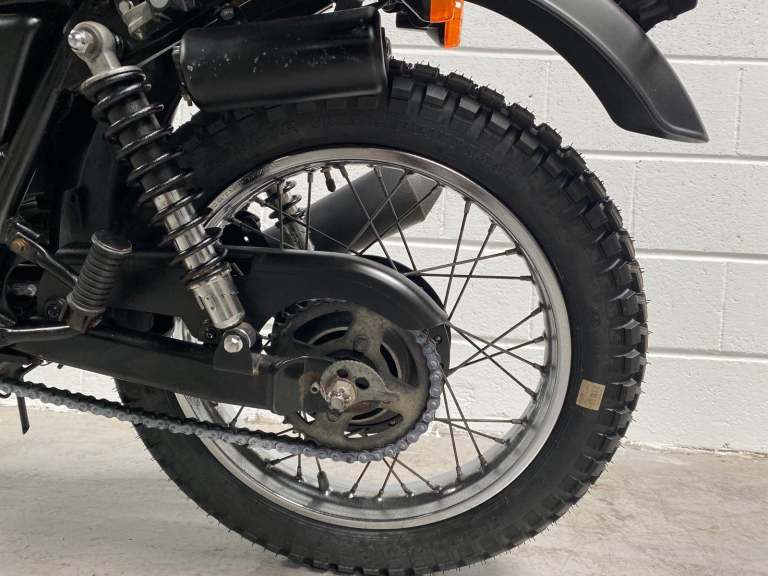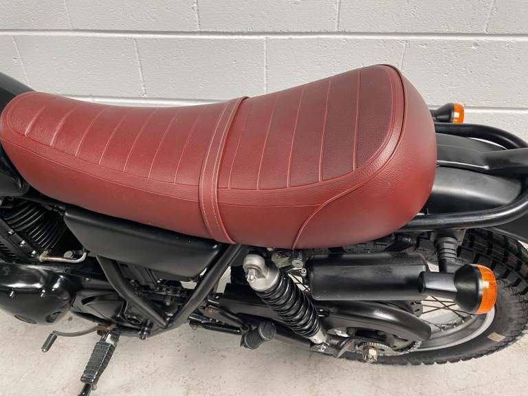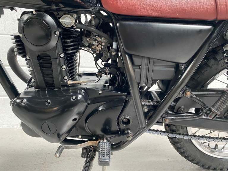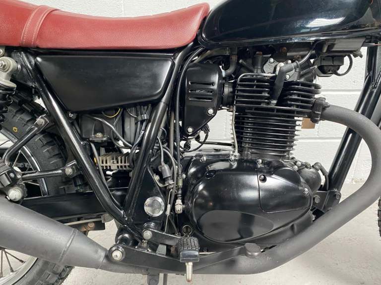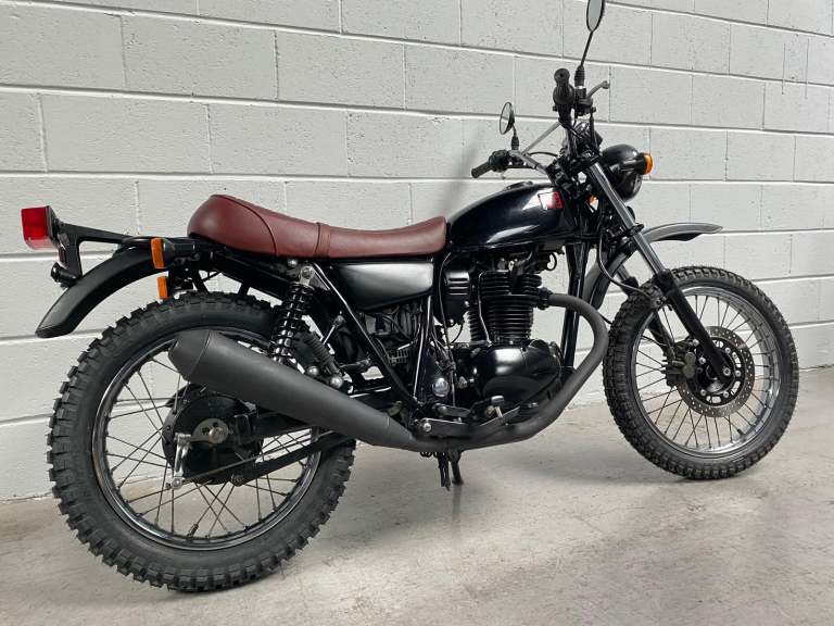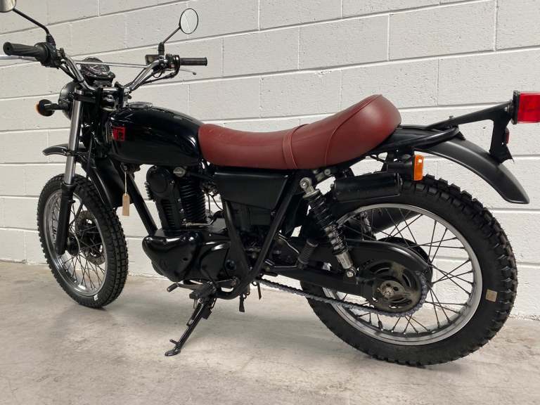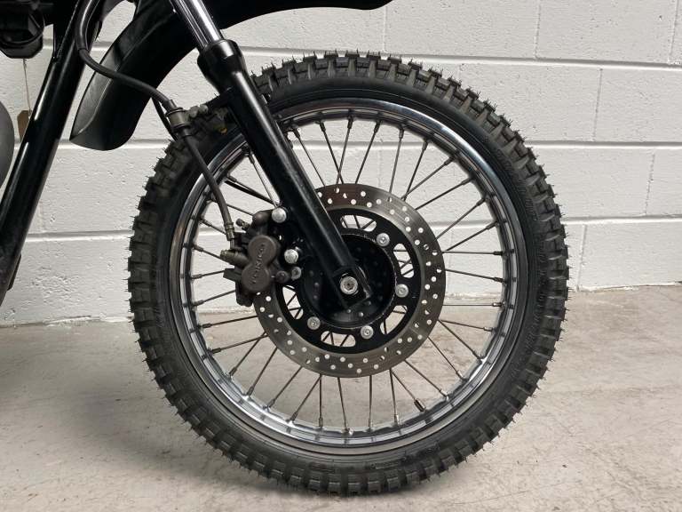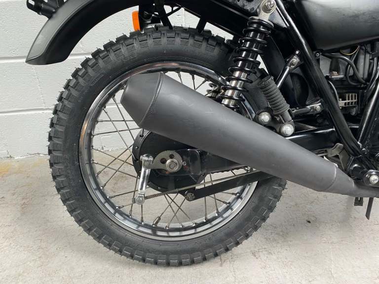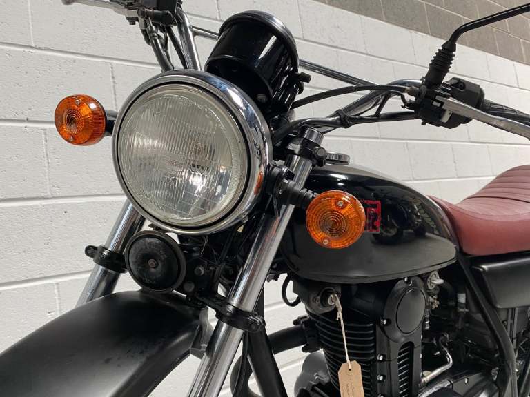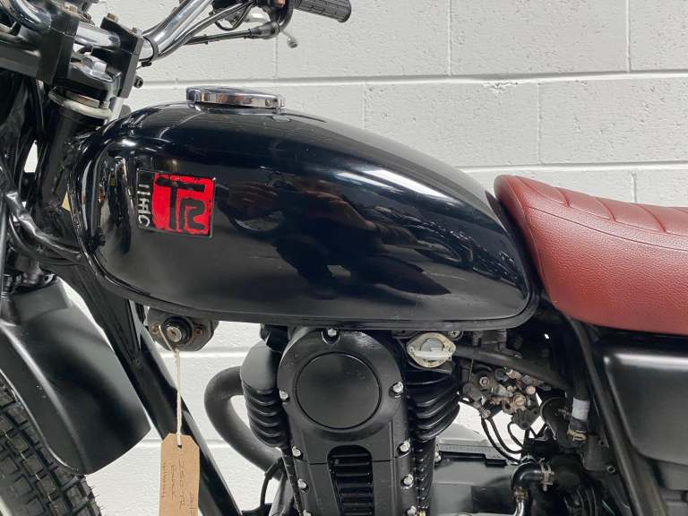 The 250TR is styled like a seventies trail bike with twin shock suspension but with modern engineering touches like fuel injection, a disc front brake and electric start. This is a beautiful example in black with black on red “TR” on the tank alongside the kanji (Chinese characters) for 250. Black engine, frame and swingarm all topped off with a tan seat. It looks very cool.