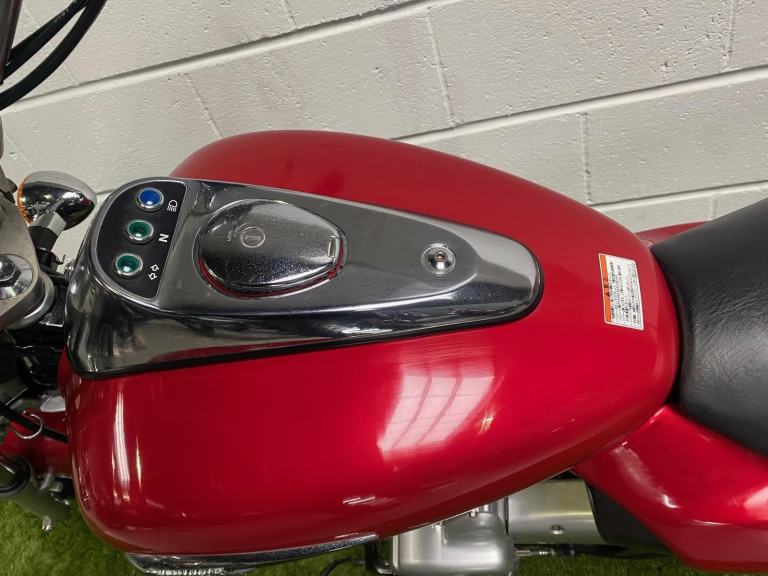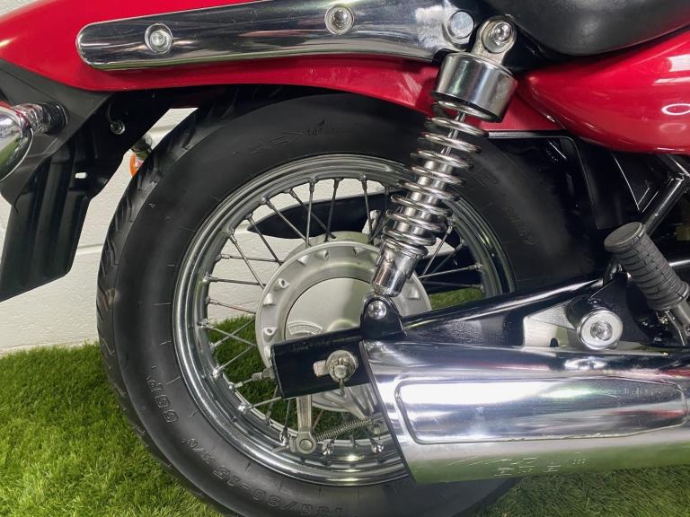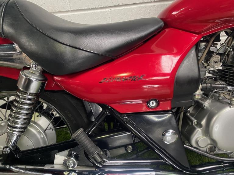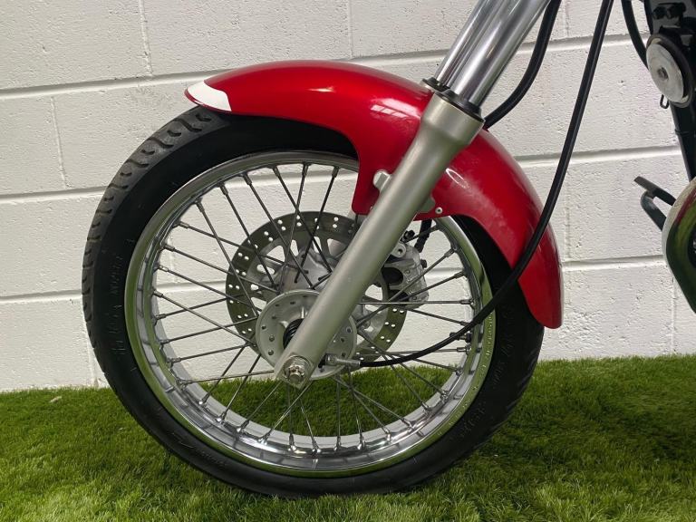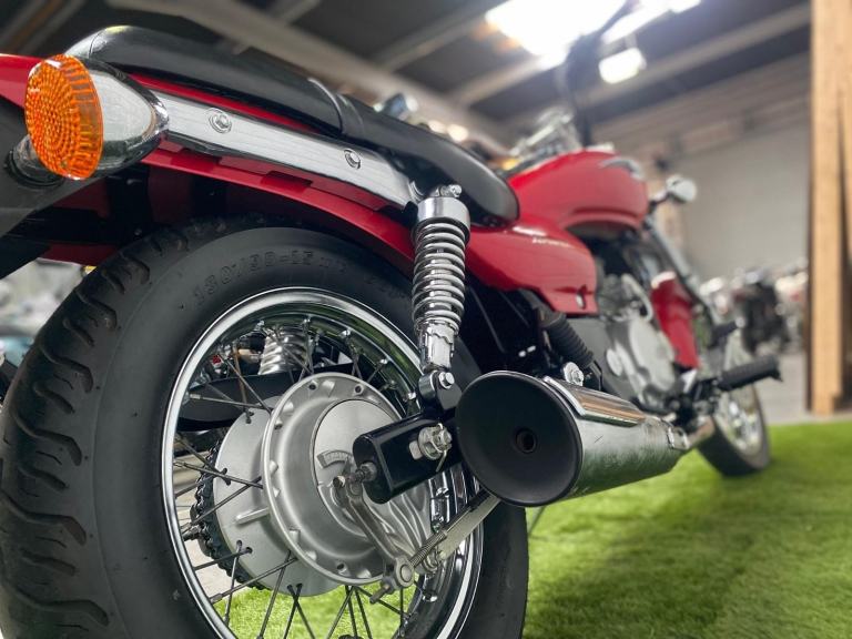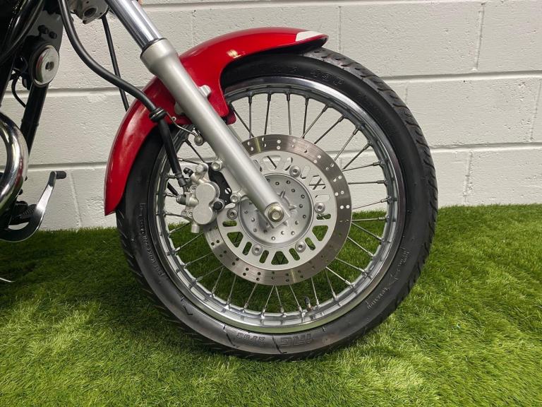 In dark red with chrome badging and a chrome fuel filler cap and light array atop the tank, it looks absolutely awesome. Chrome on the twin-shock suspension as well. The 17-inch front wheel and 15-inch rear combines with the raked forks give it a super smooth, low-slung look. It comes with electric start and a disc front brake. This air-cooled beauty weighs just 128kg dry and has a hefty 14-litre tank.
