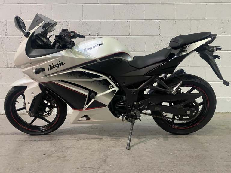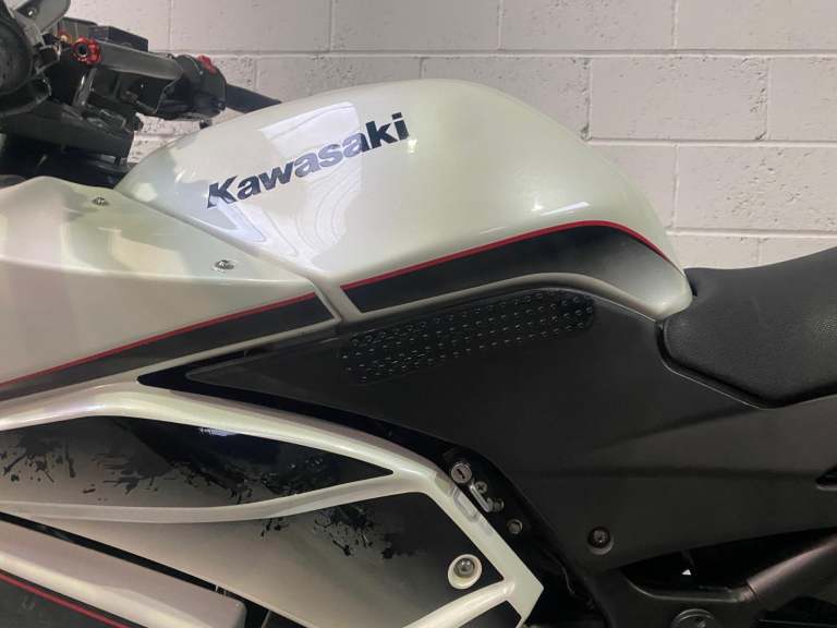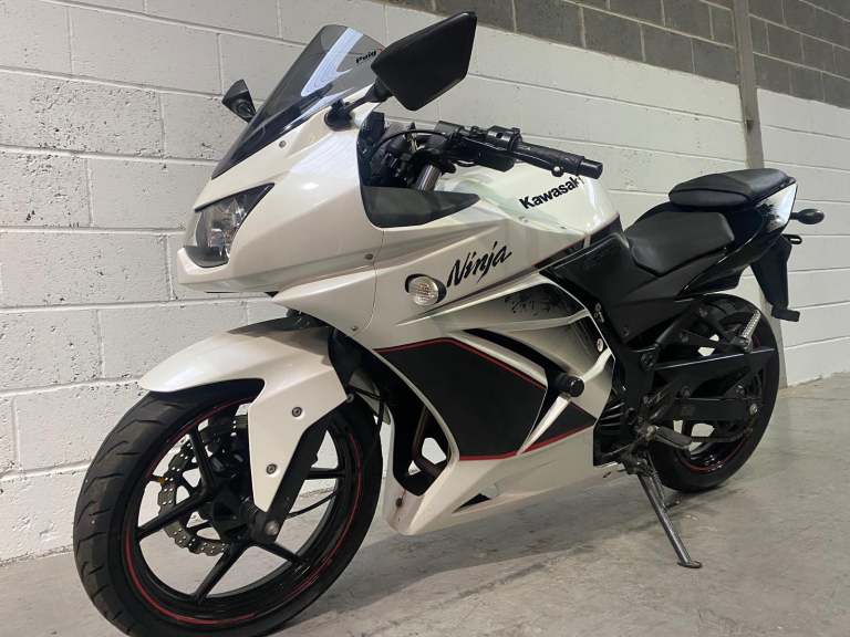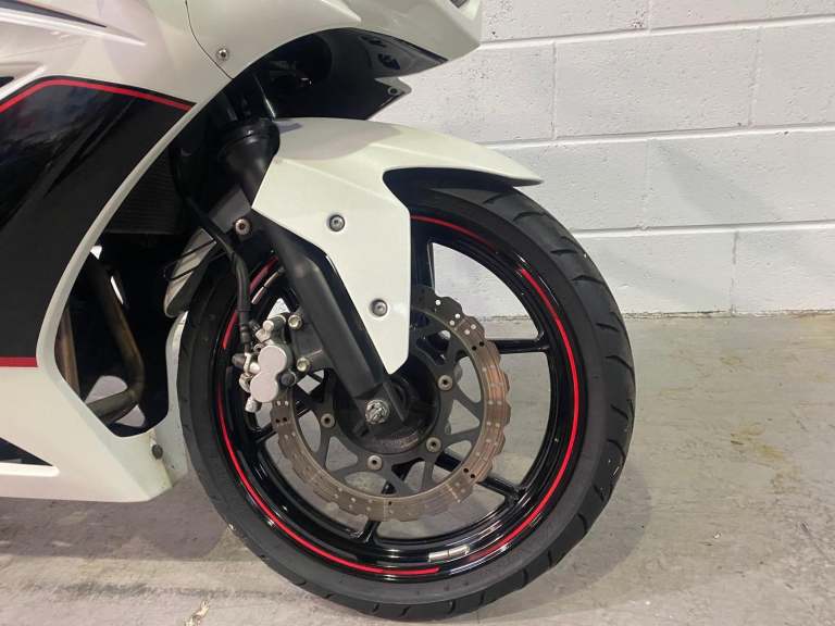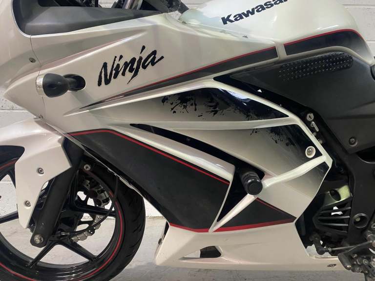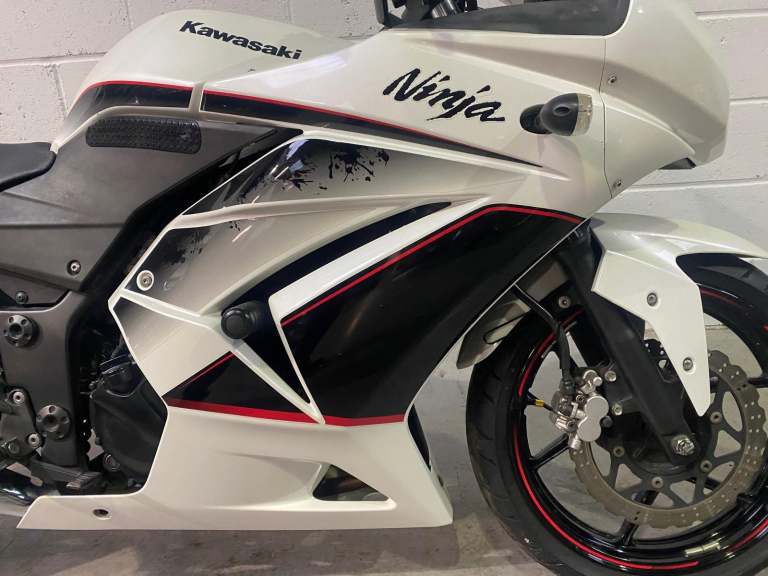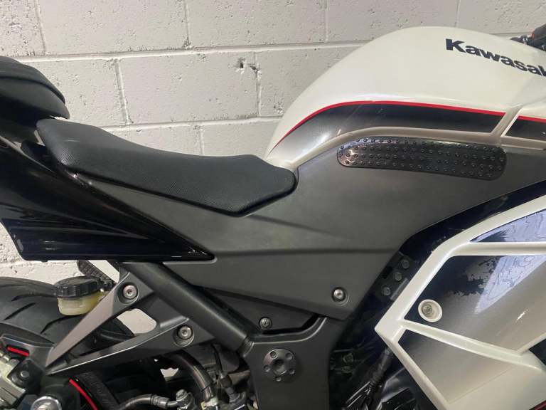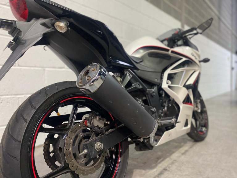 What we have here is a very cool Special Edition EX250K from 2011 in pearl white and ebony. The monochrome theme is highlighted with subtle flashes of red on the plastics and pinstripe on the black alloy wheels. Along with the glossy black on the fairing, there is matt black below the tank in front of the seat and a matt black and chrome exhaust. Fully faired and with powerful petal disc brakes, it looks ultra sleek and rides beautifully.