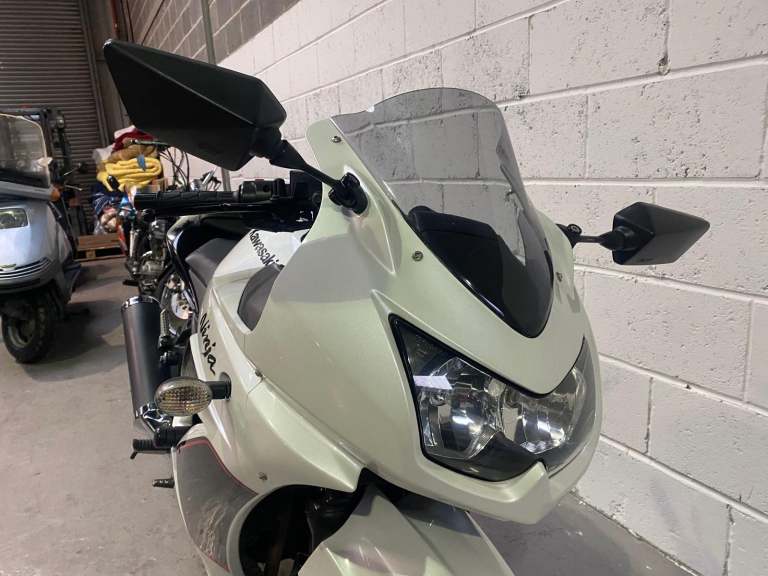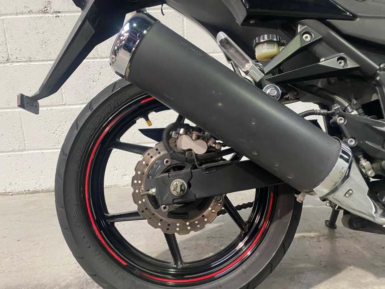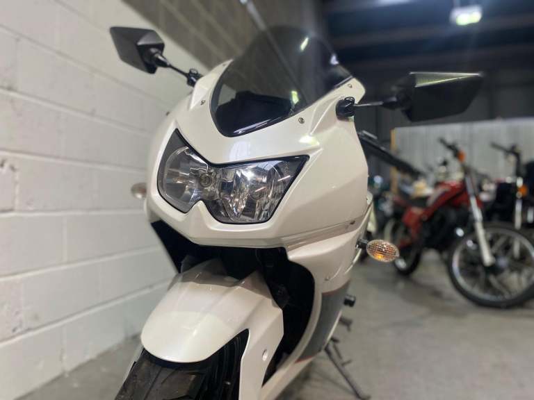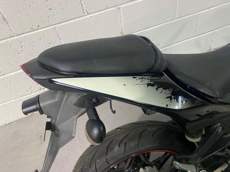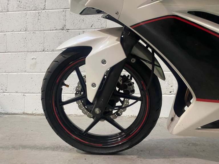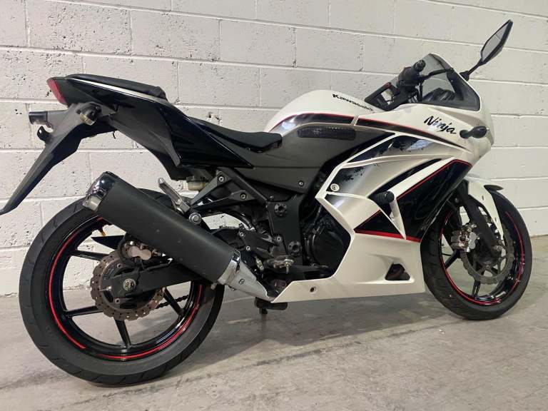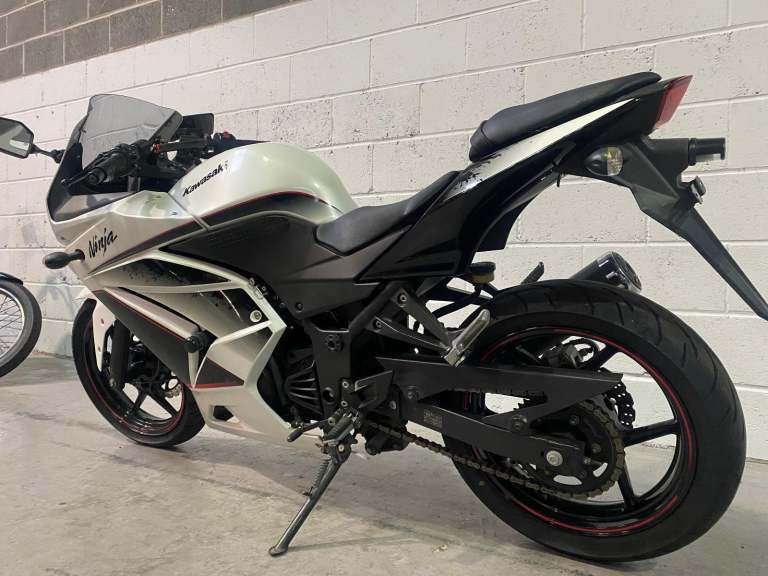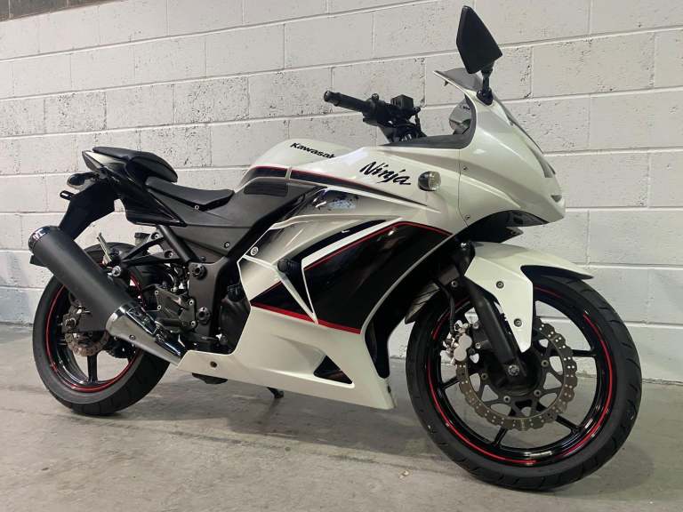What we have here is a very cool Special Edition EX250K from 2011 in pearl white and ebony. The monochrome theme is highlighted with subtle flashes of red on the plastics and pinstripe on the black alloy wheels. Along with the glossy black on the fairing, there is matt black below the tank in front of the seat and a matt black and chrome exhaust. Fully faired and with powerful petal disc brakes, it looks ultra sleek and rides beautifully.