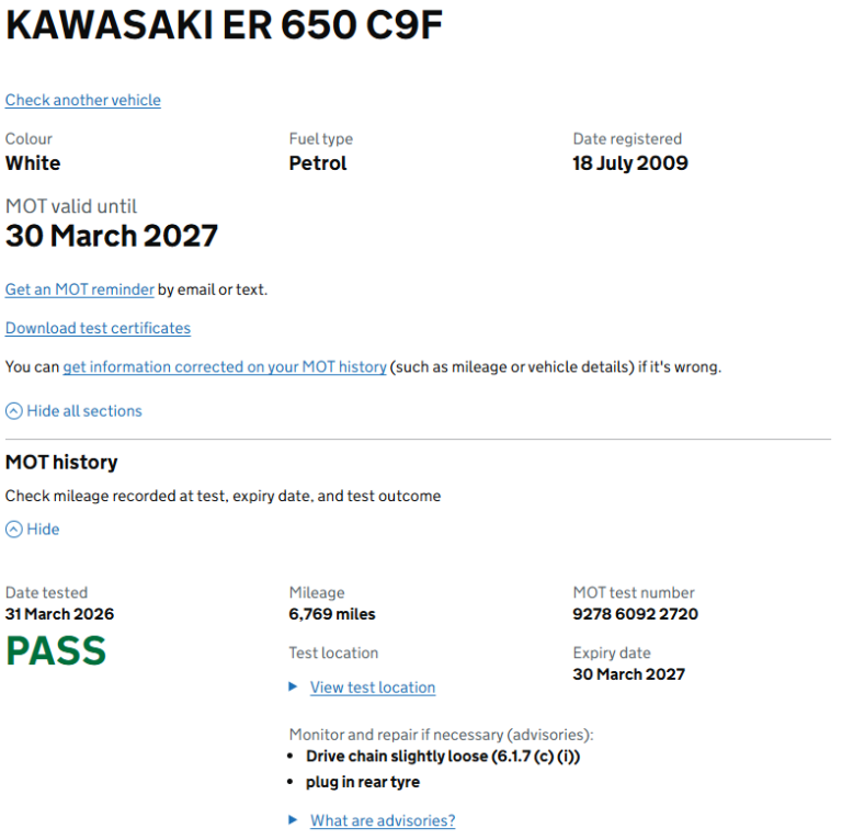 It has just had its MOT on 31 MARCH 2026, with 2 advisories: (1) drive-chain slightly loose, and (2) plug in rear tyre. I deep cleaned and lubed the sprockets & and chain prior to MOT.