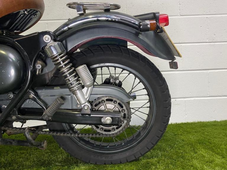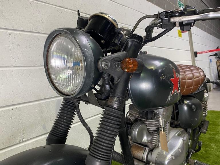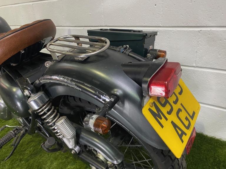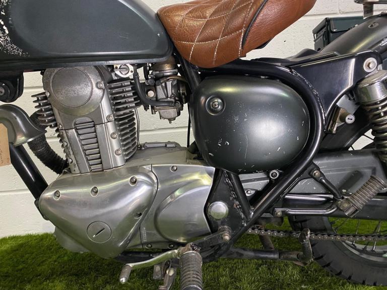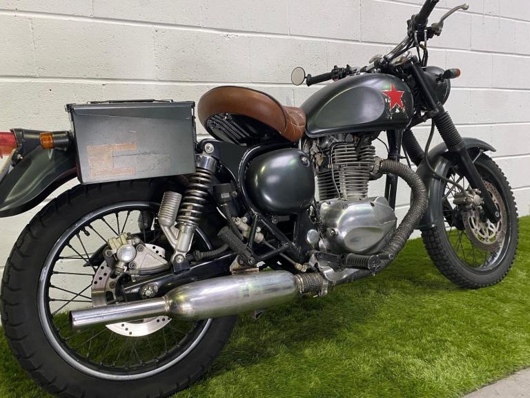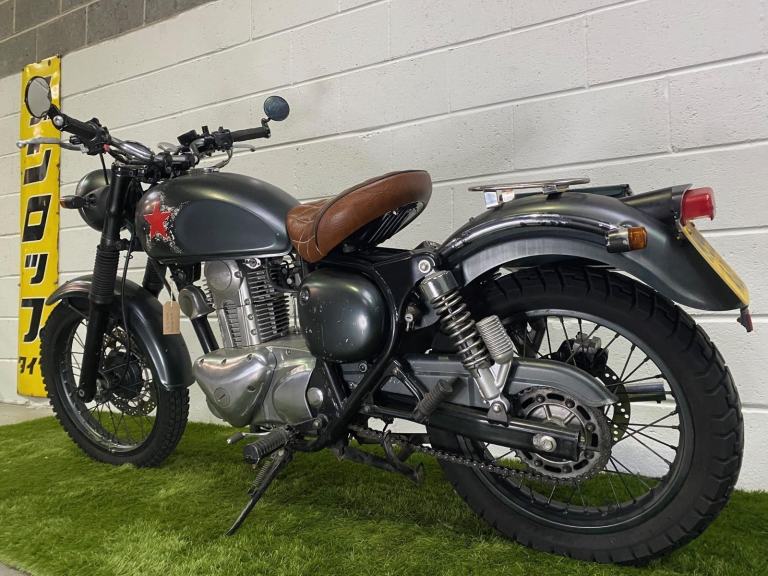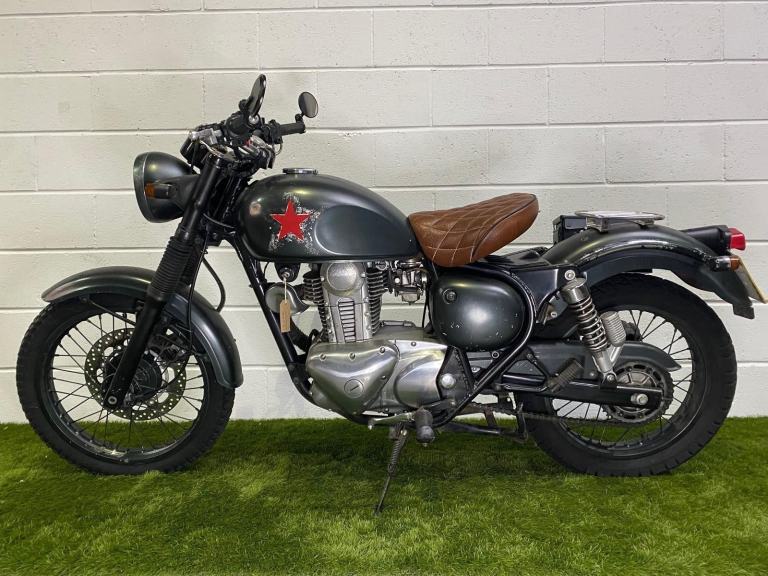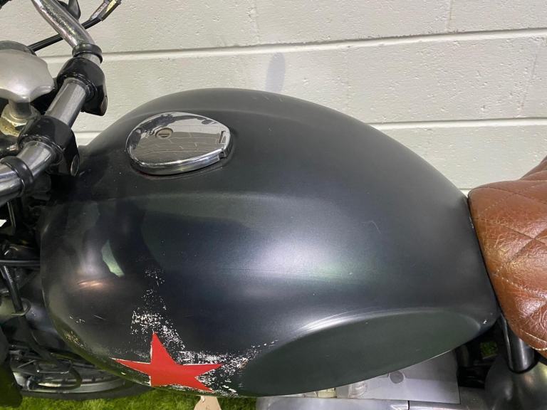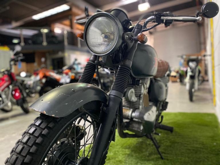 Twin shocks, matt paint, a few battle scars, spoked wheels, a single, classic look tan seat and a military style box on the side. It looks like it could have come out of one of those old war comics that they probably don’t sell anymore. The only thing that slightly takes away from the retro look is the front and rear disc brakes, but given that we’re almost as fond of stopping as we are of riding, we see that as a positive.