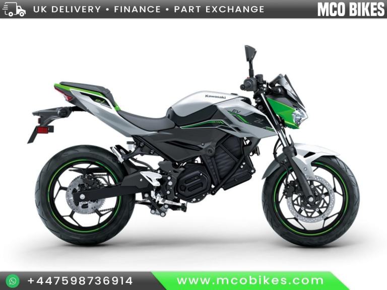 Finding pleasure in your daily commute. Kawasaki offers electrified excitement with its new pure EV motorcycles. Charge your day Z e-1. With e-boost, riders can access increased power for approximately 15 seconds. When activated, acceleration is stronger and top speed is increased: 64 km/h >> 75 km/h (ECO), 88 km/h >> 99 km/h* (ROAD). [62 km/h >> 72 km/h (ECO), 85 km/h >> 99 km/h* km/h (ROAD) for Z e-1. Air-cooled, interior permanent magnet synchronous motor. 9.0 kW {12 PS} / 2,600-4,000 rpm. 40.5 N•m {4.1 kgf•m} / 0-1,600 rpm. Metallic Bright Silver / Metallic Matte Lime Green Metallic Bright Silver / Metallic Matte Lime Green. Nationwide delivery and K-Option finance available. Buy online at [Website URL removed] or call our sales team on 01942 218181 or WhatsApp [Phone number removed].