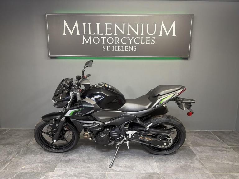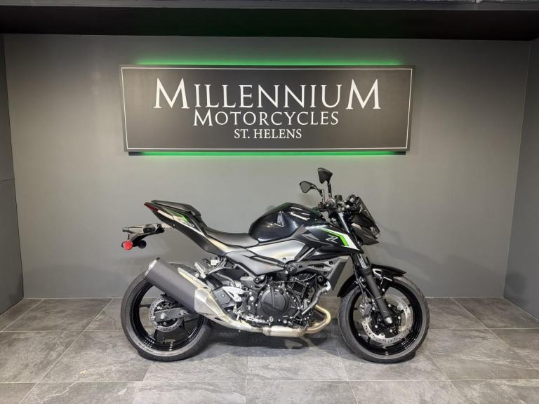 KAWASAKI Z500. All eyes are on you when riding the all-new Z500 ABS supernaked. With distinctive bodywork and a powerful 451cc engine, this aggressively styled streetfighter is for those who are not afraid to be seen. Easy to use is the key, as the compact chassis has been designed to be as user-friendly as possible. Predictable handling thanks to a chassis conceived with light weight, manoeuvrability, and mass centralisation in mind provides excellent feel and inspiring confidence for a wide range of riders. The easy handling also facilitates manoeuvring when parking. Ample power from the 451 cm3 engine is available through the entire rpm range to make it easy for riders to use, no matter what kind of riding they are doing, from low-end power for accelerating off the line in the city to top-end revs for riding on the highway. The engine in the new Z500 is up the task, no matter what it may be. Other features include LCD dash, Latest Z design, Lightweight trellis frame and Assist and slipper clutch. Choose Millennium Motorcycles for your next bike. Buy with confidence from the North West’s leading Multi-franchise dealership. Your new bike will be inspected by one of our trained technicians. Part Exchange Welcome, Finance available and Nationwide delivery. WhatsApp on [Phone number removed]or call 01744 616161. Reserve or buy online at [Website URL removed] Come pay us a visit with our amazing clothing and accessories department and on site café.