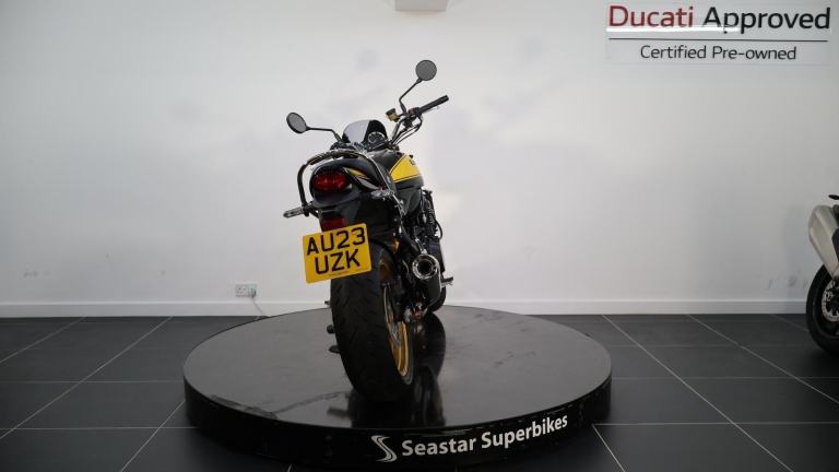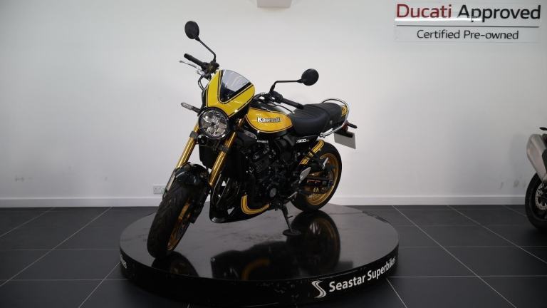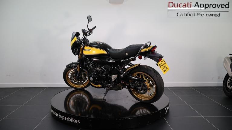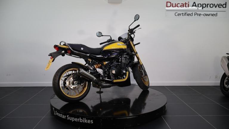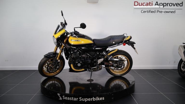 Kawasaki Z900RS SE 2023 OverviewThe Z900RS SE is Kawasaki' premium take on the retro-inspired Z900RS, blending classic styling cues with modern engineering. This particular example has been enhanced with a cafÉ racer-style shroud and bellypan, giving it a distinctive, aggressive look that sets it apart from the standard model.Performance• Engine: Powered by a 948cc inline-four engine, the Z900RS SE delivers smooth, responsive performance with a balance of torque and top-end power.• Output: Around 111 hp, ensuring lively acceleration while remaining manageable for everyday riding.• Transmission: Six-speed gearbox with assist-and-slipper clutch for smoother gear changes and reduced wheel hop under hard downshifts.Technology and Rider Aids• Electronics: Features Kawasaki Traction Control (KTRC) with selectable modes, enhancing safety and rider confidence.• Braking: Equipped with Brembo M4.32 calipers and a Brembo front master cylinder, providing strong and precise braking performance.• Suspension: Öhlins S46 rear shock and upgraded front forks deliver superior handling and comfort compared to the standard Z900RS.Styling and Design• CafÉ Racer Enhancements: The addition of a shroud and bellypan gives the bike a sportier, more aggressive stance, echoing the cafÉ racer tradition while retaining the RS' retro charm.• SE Details: Gold-finished forks, unique paintwork, and premium detailing distinguish the SE from the standard model.• Retro Inspiration: The overall design pays homage to Kawasaki' legendary Z1 of the 1970s, blending heritage with modern [Website URL removed] and Everyday Usability• Ergonomics: Upright riding position with a comfortable seat makes it suitable for longer rides as well as city commuting.• Versatility: While styled as a retro sport machine, the Z900RS SE remains practical for daily use thanks to its smooth engine and balanced chassis.ValueThe 2023 Z900RS SE with cafÉ racer-style shroud and bellypan offers a unique combination of heritage styling, premium components, and modern performance. It appeals to riders who want a motorcycle that is both visually striking and technically advanced.