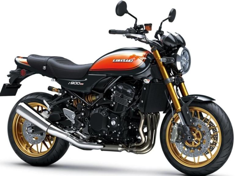The SE variant features a Brembo brake package including front calipers and ø300 mm Brembo disc rotors with steel braided hoses plus a high-grade Öhlins rear shock with remote reservoir adjuster to deliver a plusher ride feel and even greater control. A USB-C socket appears on the right side of the handlebar while the overall look echoes a variation of the iconic “Fireball,” Z1 colouring using enhanced saturation orange graphics and a body colour changed from brown to metallic black