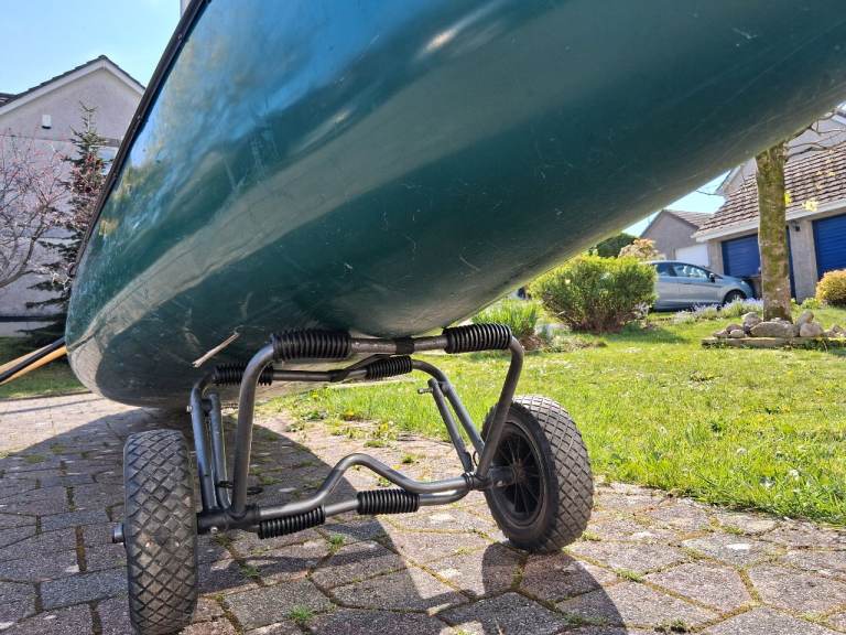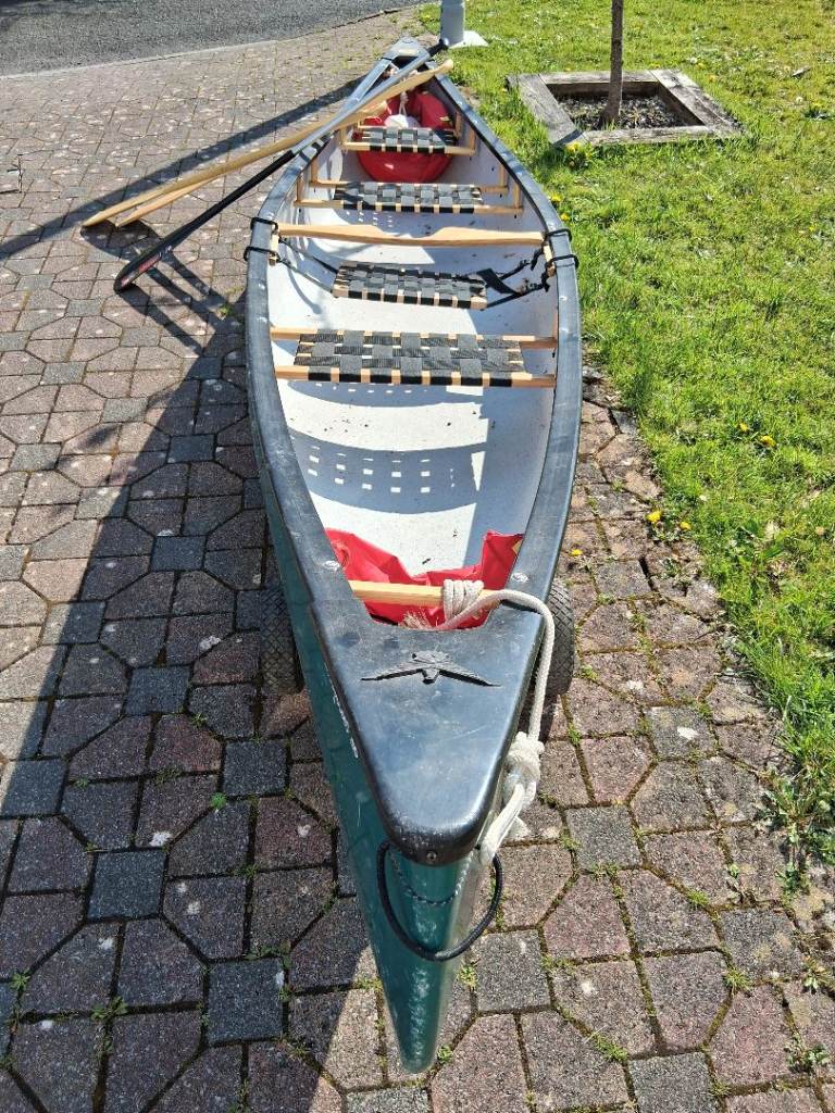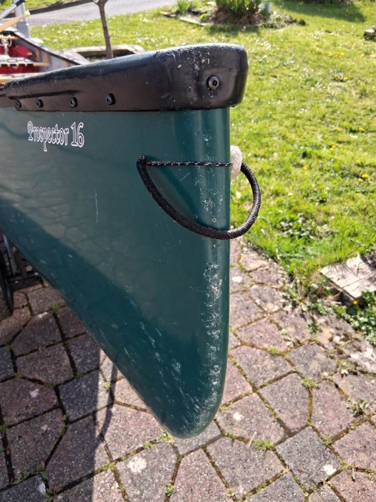 16ft Canadian canoe, suitable for a family of four (Nova Craft, Prospector 16). This is a great canoe for sheltered and inland waters (rivers, lakes, estuaries and protected bays). Ideal for a family with younger children or less confident swimmers (rated to carry 409 kg total load). We're giving it up as we have moved to sea kayaks and surfboards. Two wooden paddles + spare aluminium paddle included. Three permanent seats + hanging seat (four seats total). Removable floatation bags in bow and stern (Palm). 16 ft painter. Kept in garage (no UV damage). Minor scratches (see pictures). Wheels not included. Buyer to collect, though I can help with a local delivery.