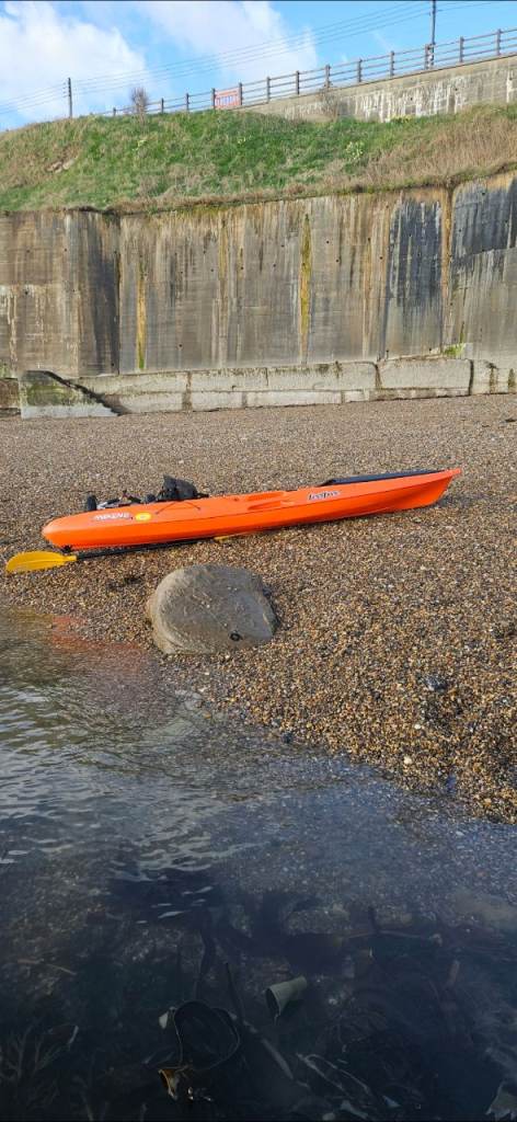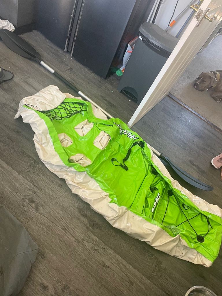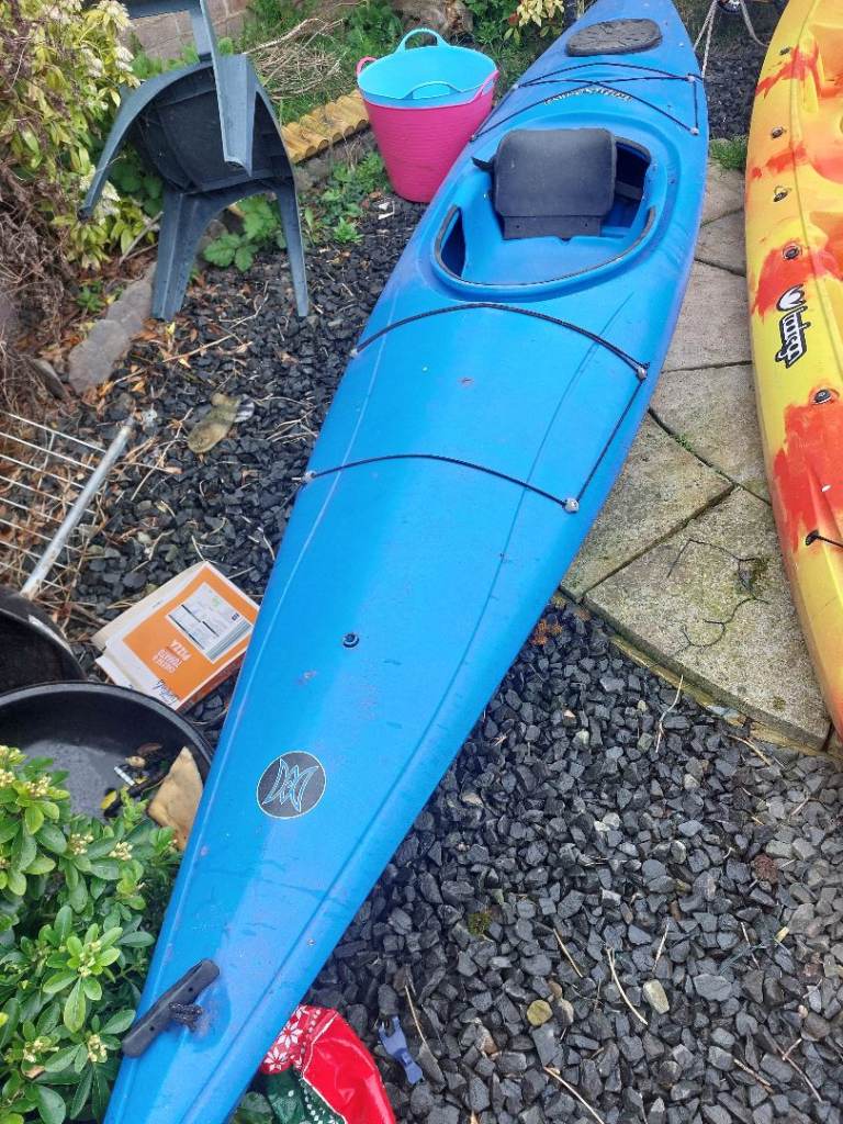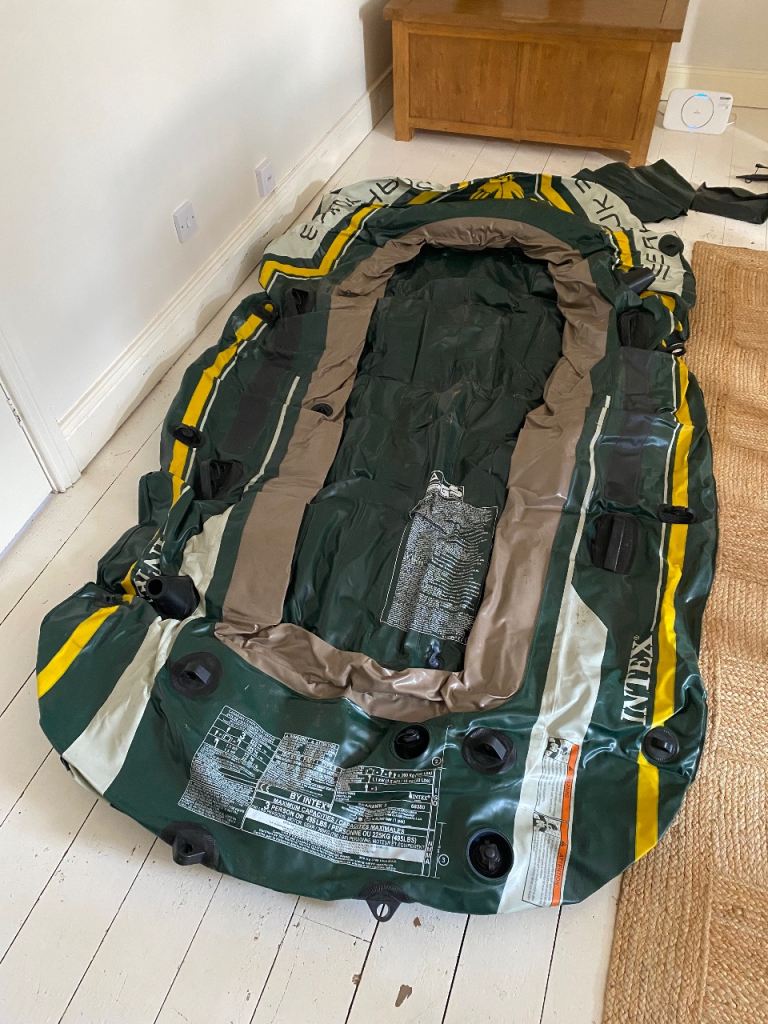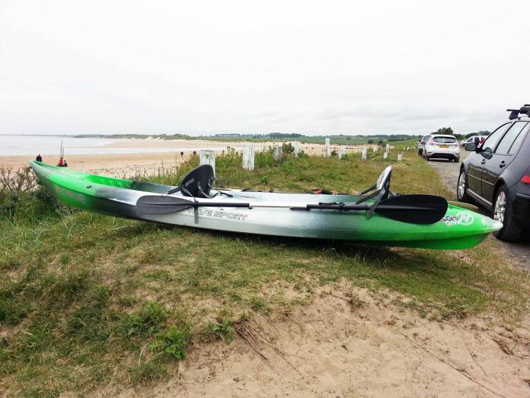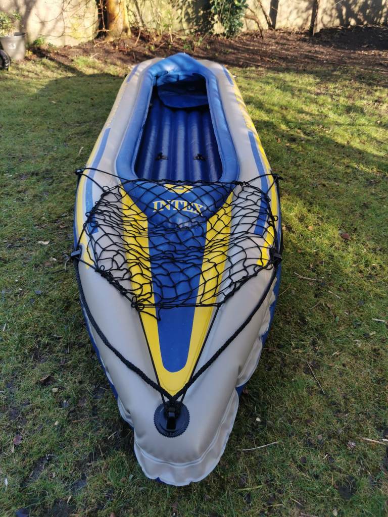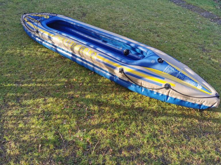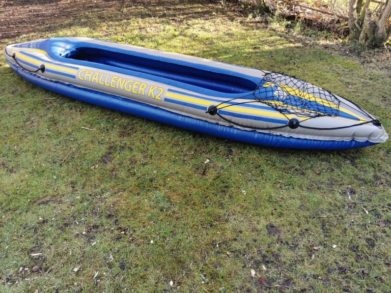 The kayak fits 2 adults and one child, 2 adults and a dog, or 2 adults and camping gear