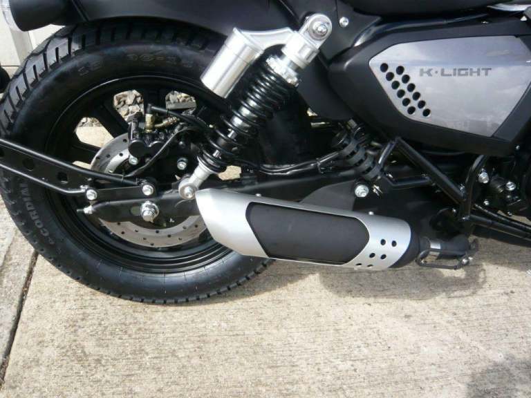 The bike sports a singlecylinder, fourstroke, aircooled engine with two valves to ensure smoothness and agility in all conditions. Its maximum power is 7.8 kW at 9000 rpm, with torque of 8.9 Nm at 7500 rpm. The typical teardropshaped tank and the round headlight give this bike a soul that is purely cruiser. Even the comfortable seat offers a very relaxed riding position. The braking system features a 280 mm disc CBS on the front and in the back a 240 mm disc CBS. Klight 125 mounts a 17 rim on the front and 15 on the back, respectively with 9090 and 13090 tyres
