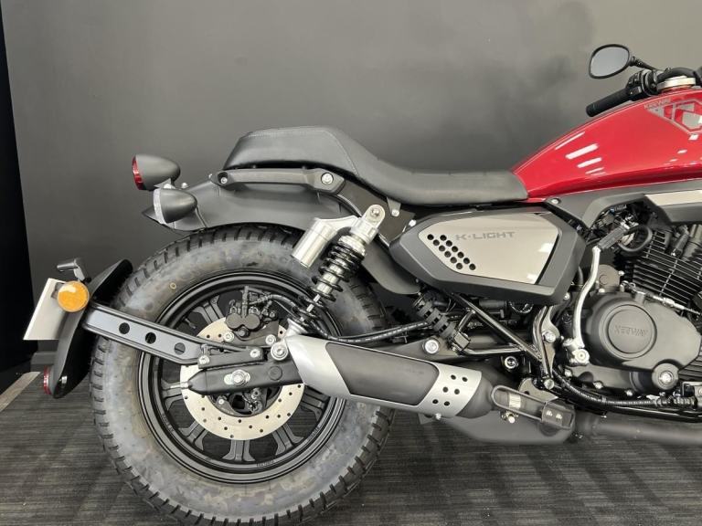If ever a bike looked the way it felt to ride then K-Light is that bike, A low seat height and forward Footpegs give a relaxed and involved feel to the smooth, responsive power the K-light delivers with ease. A big bike look at less than 145 kilos lets you skip through the traffic or breeze along the apex of twisty lanes. Feel is everything and the twin rear shock and traditional front fork set up informs of every undulation with effortless accuracy.