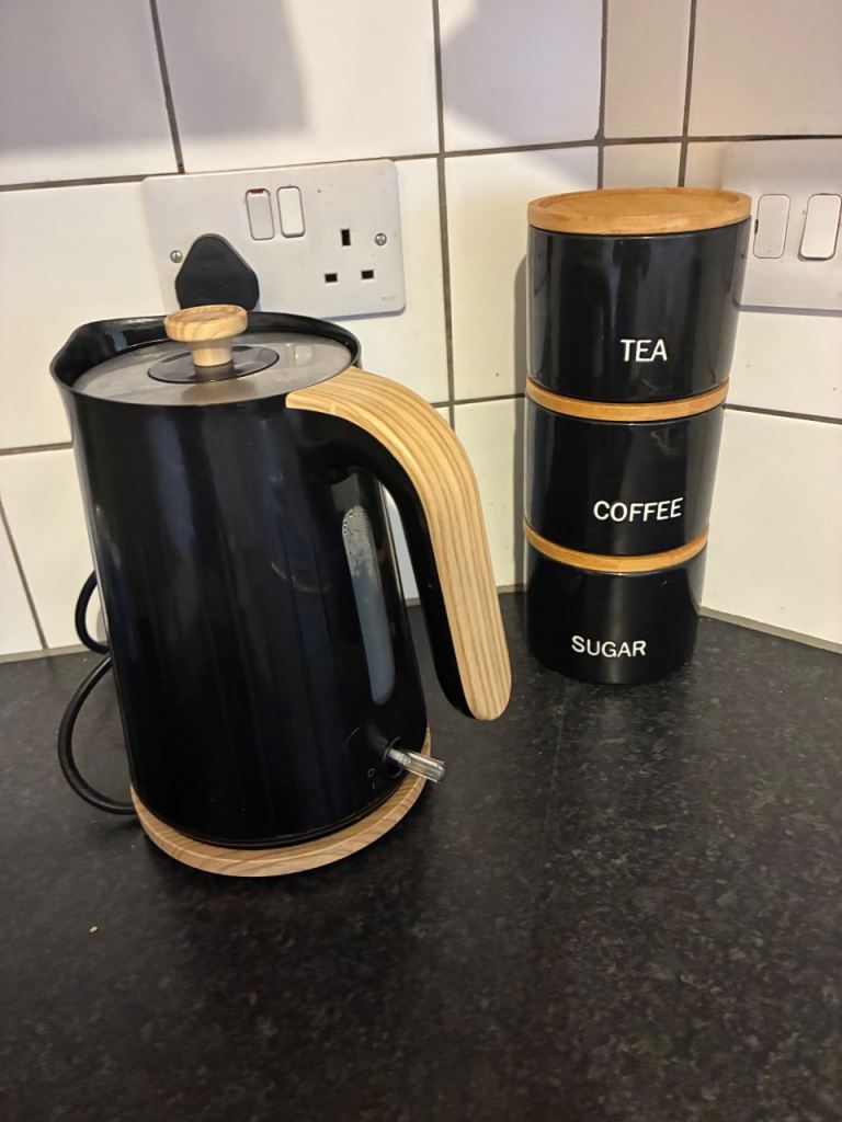 Black kettle and tea coffee sugar set