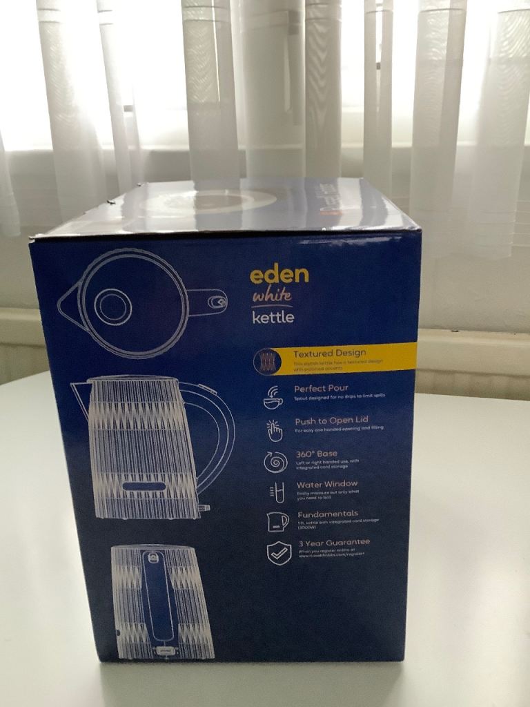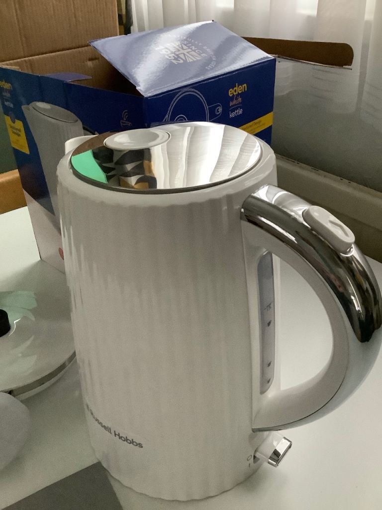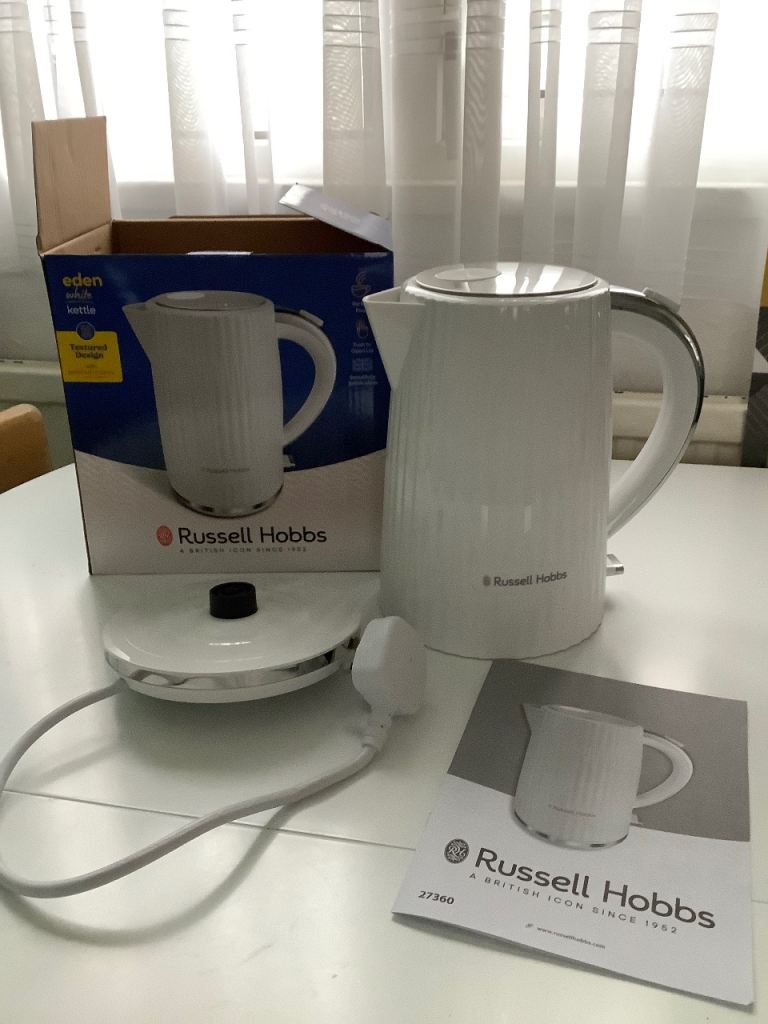 Russell Hobbs 'Eden' white kettle. Textured design with polished accents.