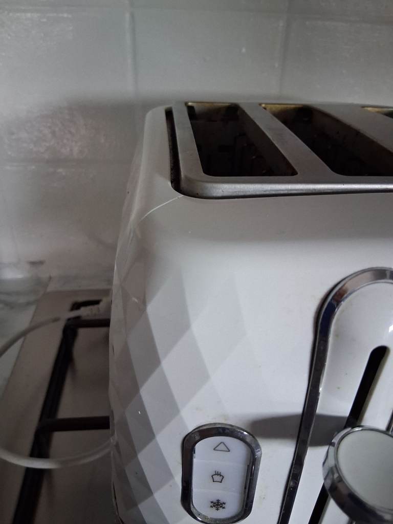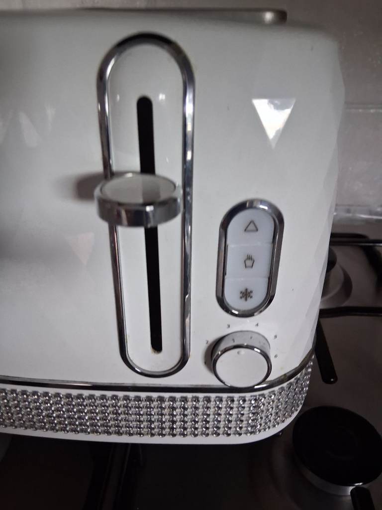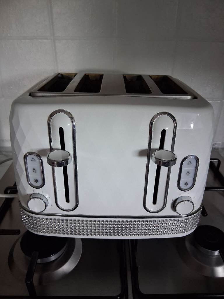 WHITE/CHROME DIAMANTE 4 SLICE TOASTER 2 SLOTS CAN BE USED SEPERATELY WITH DIFFERENT BROWNING LEVELS DOES FROZEN BREAD AND HIGH LIFTS FOR CRUMPETS ....£15