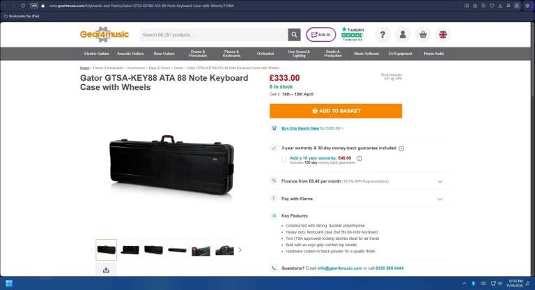 Gator TSA 88 Professional Hard Extra Large Keyboard/Piano/Synth Case With Wheels Costs £330 New
