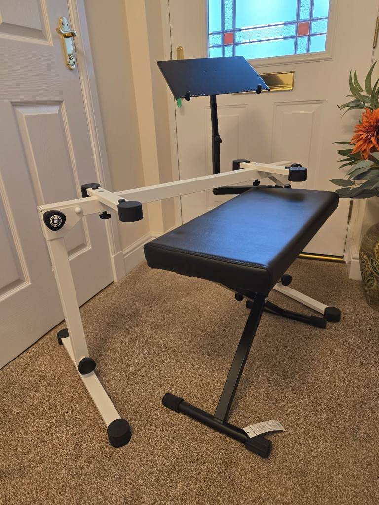 Comes with Stacker for second keyboard (Stull Boxed, Not Shown), Laptop/Music Stand (Black) and Keyboard Bench (Black).