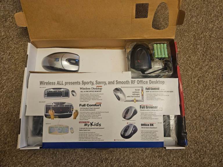 Features: Ergonomic A-shape keyboard and optical mouse.