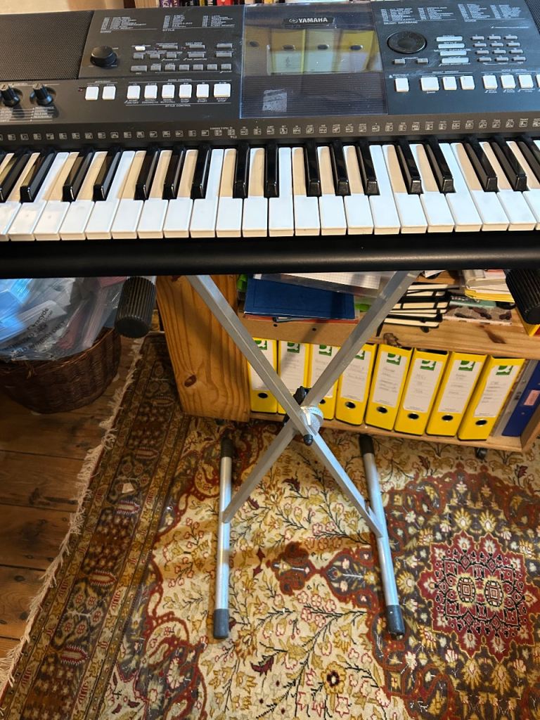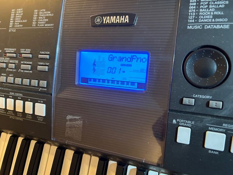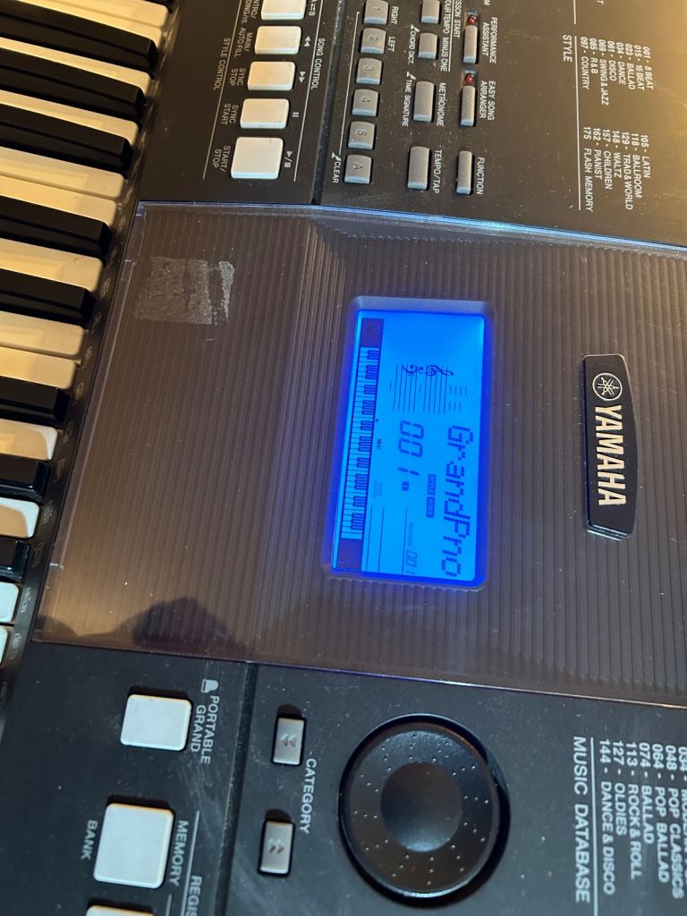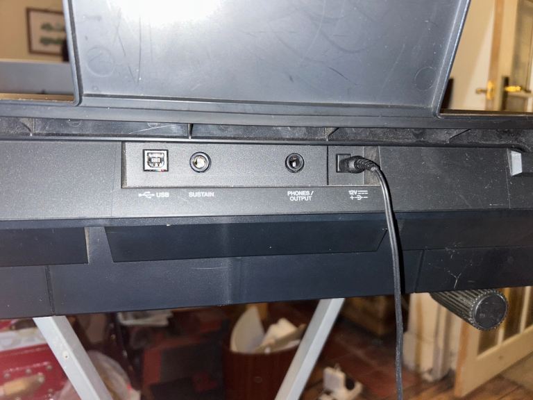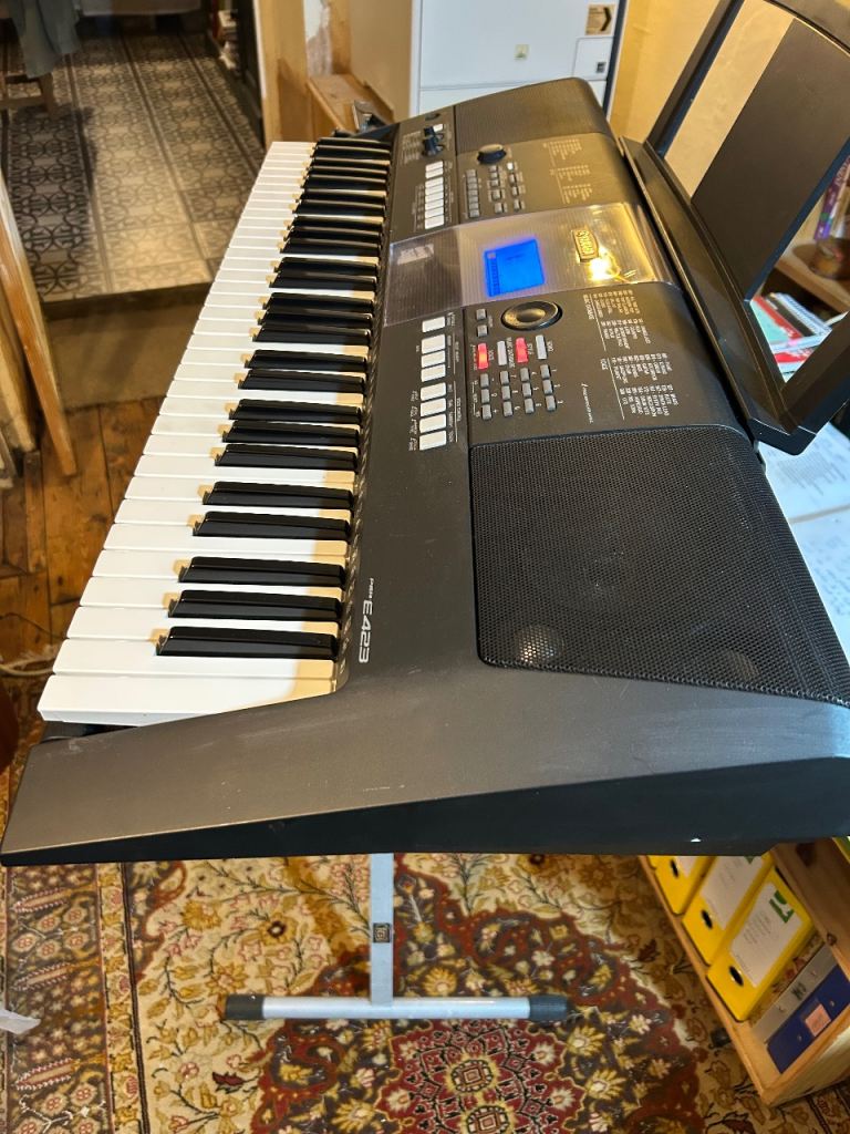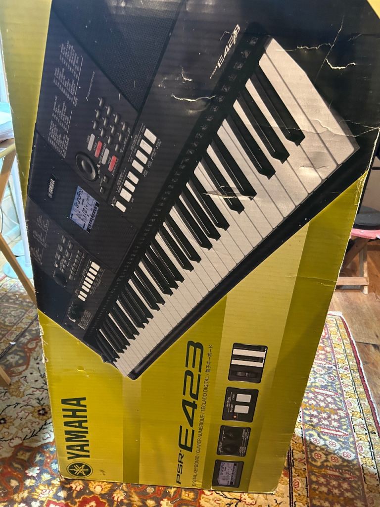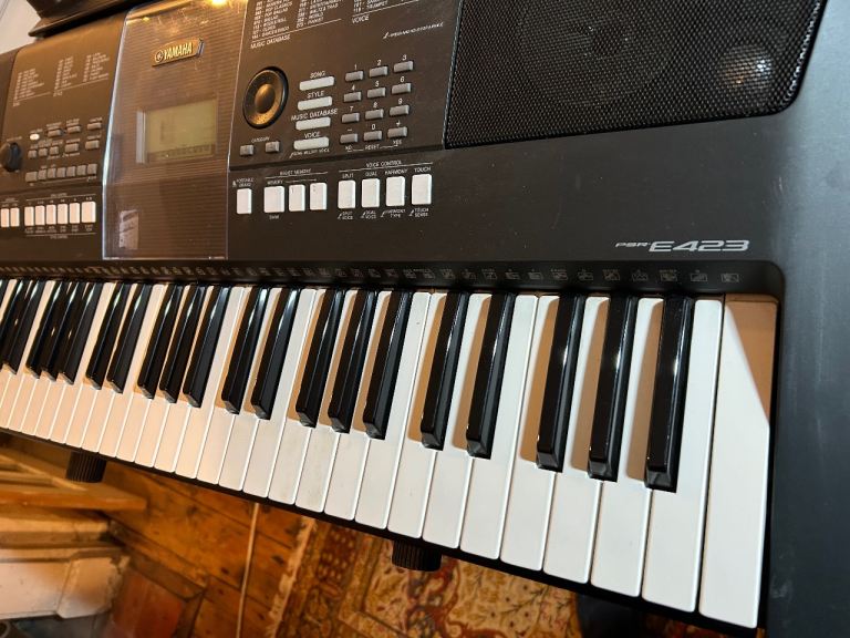 Yamaha PSR-E423 electronic keyboard with 61 touch-sensitive keys. Great-sounding, reliable keyboard ideal for beginners or intermediate players. Features built-in speakers, lots of voices and styles, arpeggiator/pattern functions, and USB MIDI connection for computer use. Well-built and easy to use. A solid, versatile keyboard.