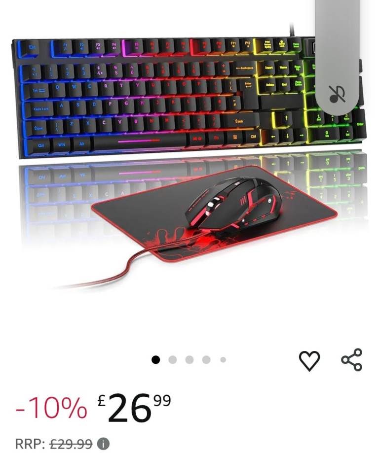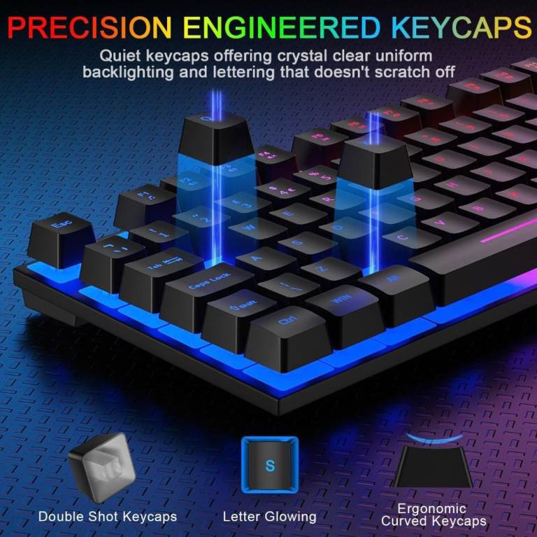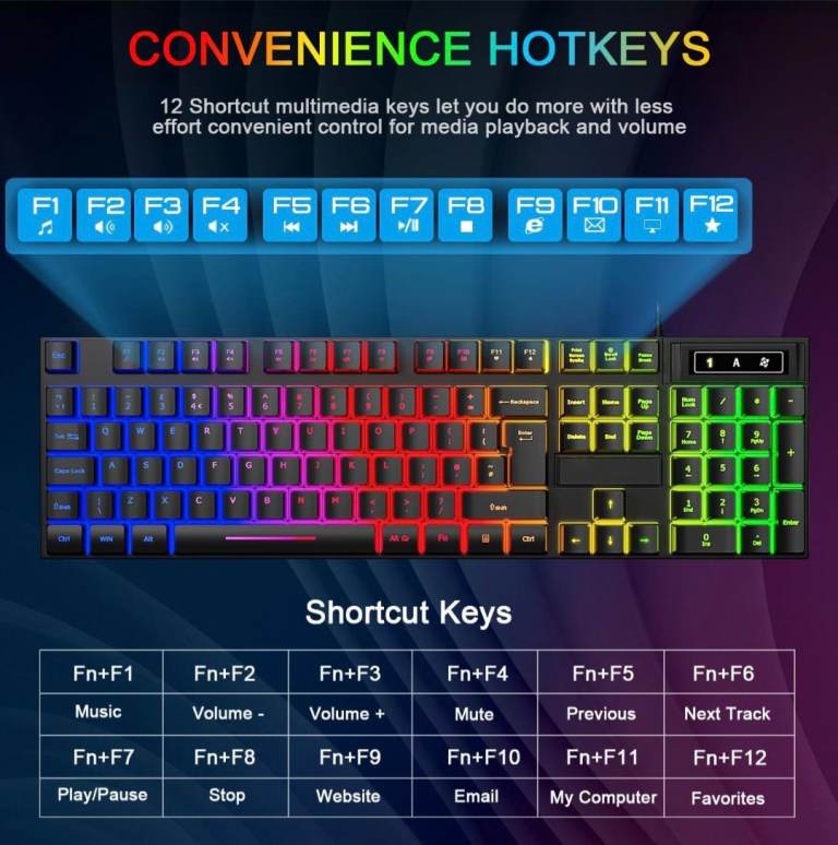 The Rewurnth Rainbow Gaming Keyboard and Mouse Set with Large Mouse Pad is a wired keyboard and mouse designed specifically for gaming. The keyboard features a standard QWERTY layout and comes in a multicoloured rainbow design, adding a colourful touch to your gaming setup. The mouse pad is large, providing ample space for precise mouse movements during intense gaming sessions. The English language keyboard and compatibility with a wide range of devices make this set a great choice for gamers looking for a stylish and functional peripherals bundle.