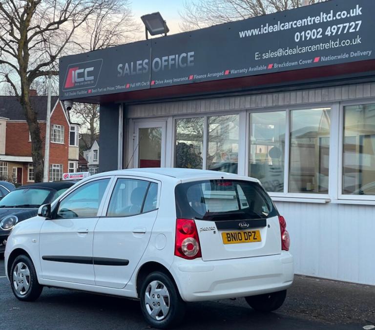 General Vehicle Information Year: 2010 Make: KIA Model: PICANTO 1 Engine Size: 1.0L Transmission: 5 SPEED MANUAL Body Style: 5 HATCHBACK Fuel: PETROL MPG: BHP: Registration: BN10DPZ Current Mileage: 38,753 Number of previous owners: 2 Number of keys: 2 V5 Doc: Present MOT Expiration Date: New 12 month MOT Service History: Present Road Tax per year: £35.00 Don't let it get away! Hold this vehicle with a fully refundable £99 deposit reserve online or call and speak to our sales manager Vehicle Specification: Top 5 Features: Exterior Spec: Interior Spec: service history: Vehicle Purchase Price: £2,495.00 Full Dealer Facilities Buy with confidence All of our vehicles undergo a comprehensive multi-stage quality and safety assurance inspection, ensuring each vehicle meets our high preparation standards before they go on sale. Every aspect of your vehicle is inspected, including: Vehicle Exterior Bodywork, Vehicle Interior Condition, Brake Discs, Pads, Shoes & Drums, Oil Leaks, Gearbox Operation, Steering, Suspension, Engine Performance, Exhaust Condition, Wheel Balance/Tracking Tyre Depths & Pressures, Electrical Systems, Road Test, Many more. Will also come with a up to date service and new 12 month MOT if required. Buy a car online from the comfort of your home No matter where you are, we’ve made it really easy to buy a car online in 3 simple steps. 1:Choose your car Reserve online for £99 or speak to our contact center you can also request a personalized video. 2:Paperwork and payment made easy Complete your deal online, including part-exchange and any finance. 3:Choose your delivery option Contactless Click & Collect and home delivery available. FOR MORE INFO PLEASE CALL OUR SALES TEAM We are open 6 days a week Monday- Saturday 9:00am till 6:00pm. Appointments only Click and Collect Service Available Open to Inspection and Viewing HPI Checks Done on all Vehicles Nationwide Delivery Available England, Scotland and Wales Extended Warranty Available up to 6,12 or 24 Months Warranty policies to suit our individual needs. Talk to one of our highly trained sales Managers to decide what suits you best. Driveaway Cover Available Part Exchange Available Brake down cover Available For more information please call our office on [Phone number removed] or 01902497727 or visit our website / social media @idealcarcentreltd for more photos and info.. Adjustable Steering Column/Wheel,Air Bag Driver,Air Bag Passenger,Anti-Lock Brakes,Ashtray/Lighter,Body Coloured Bumpers,Central Door Locking,Centre Console,Child Locks,Cigar Lighter,Cup Holder,Electric Windows (Front),Electronic Brake Force Distribution,Head Restraints,Heated Rear Screen,Immobiliser,In Car Entertainment (Radio/CD/MP3),Mirrors External,Power Socket,Power-Assisted Steering,Rear Wash/Wipe,Seat - ISOFIX Anchorage Point,Seat Belt Pre-Tensioners,Seats Split Rear,Side Protection Mouldings,Spare Wheel,Speakers,Steel Wheels,Tinted Glass,Tyre Repair Kit,Upholstery Cloth/Vinyl,Windscreen Wiper