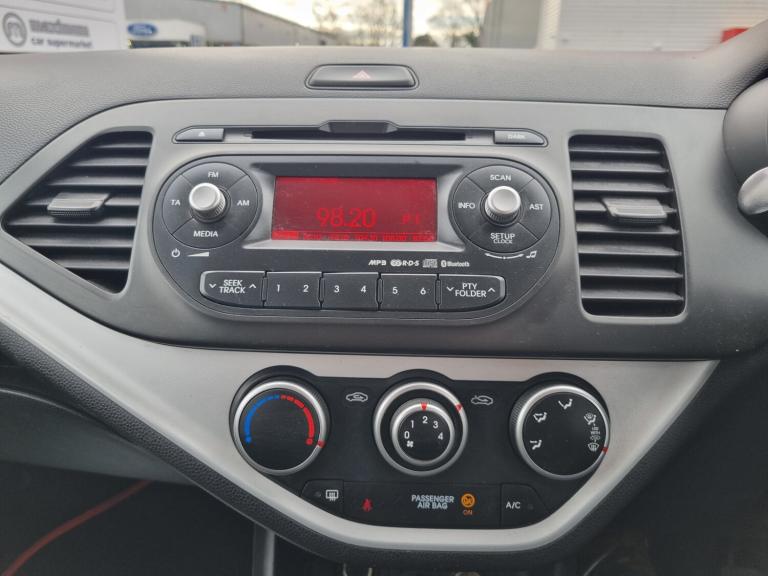 KIA PICANTO 1.0 VR7 3dr - Only £20 Tax per year, 2 keys, Bluetooth connectivity with voice control, Digital clock, Reversing Aid Sensors, Trip computer, Bluetooth audio streaming, iPod connection lead, RDS radio CD with MP3 player, Steering wheel mounted controls, USB and auxiliary socket, Adaptive brake lights, Day/night rear view mirror, Daytime running lights, Electric adjustable heated door mirrors, Electric front windows + drivers one touch, Tinted glass, 12V socket, Cupholders in centre console, Driver seat height adjust, Isofix child seat attachment, Leather steering wheel and gear knob, Manual air conditioning, Passenger under seat storage tray, Premium cloth upholstery, 3x3 point rear seatbelts, Dual front airbags, Passenger airbag deactivate switch, Alarm/immobiliser/remote central locking, 14"" alloy wheels. Finance & Part exchange welcome