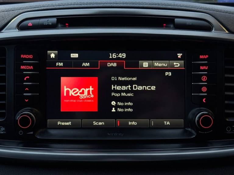 .12V Power Socket, 12V Power Socket - 2nd Row, 18in Alloy Wheels, 3 x Passenger Assist Grips, 60-40 Split Folding 2nd Row Seats, 8in Touchscreen, 8in Touchscreen Satellite Navigation with European Mapping, ABS - Anti Lock Braking System, Adaptive Front Lighting System, Airbags - Driver, Airbags - Front Side, Airbags - Passenger, Airbags - Twin Curtain, Alarm System, All-Round Height Adjustable Headrests, Ambient Light - Front Centre Console Tray Illumination, Armrest - Rear Centre, Auto Dimming Rear-View Mirror, Automatic Headlight Control, BAS - Brake Assist System, Bluetooth with Music Streaming, Bluetooth with Voice Recognition, Body Coloured Bumpers, Body Coloured Door Mirrors, Centre Console Cupholders, Centre Console Storage, Child Safety Rear Door Locks, Cornering Lights, Cruise Control, Cupholders - Rear, DAB Radio, Dash Illumination Dimmer Switch - Rheostat, Deadlocks, Door Handles - Chrome, Drive Mode Select, Dual Automatic Air Conditioning with Ioniser, EBD - Electronic Brakeforce Distribution, ESC - Electronic Stability Control, Electric Parking Brake with Auto Hold Function, Electric Windows - Front and Rear with Auto Up-Down Function, Electrically Folding Door Mirrors, Emergency Stop Signalling - ESS, Engine Immobiliser, Engine Start-Stop Button, European Mapping, External Amp, External Temperature Display, Front Cabin Map Light, Front Centre Console Armrest, Front Door Courtesy Reflectors, Front Fog Lights, Front Passenger Airbag Cut Off Switch, Front Seatback Pockets, Front and Rear Door Storage, Full Size Alloy Spare Wheel, Glovebox with Illumination, Head Rests - Front Active, Headlight Levelling System, Headlight Washers, Headlights - Xenon with Auto Levelling, Heated Front Seats, Heated Outer Rear Seats, Heated Steering Wheel, Hill-Start Assist Control - HAC, ISOFIX Child Seat Top Tethers and Anchor Fixings, Impact Sensing Auto Door Unlocking, Infinity Premium Sound System, Integrated Indicator Lights LED in Door Mirrors, Interior Door Lock-Unlock Function, LED Daytime Running Lights, LED High Mounted Brake Light, Lane Departure Warning System, Leather Trimmed Gear Shift, Leather Trimmed Steering Wheel, Locking Wheel Nuts, Low Level Washer Fluid Warning, Luggage Compartment - Hooks, Luggage Compartment - Load Cover, Luggage Compartment - Net, Motor Driven Power Steering - MDPS, Mouldings - Side Sill - Black, Panoramic Sunroof - Electric One Touch with Safety Function, Pedals - Alloy, Pollen Filter, Privacy Glass - Rear Windows and Tailga